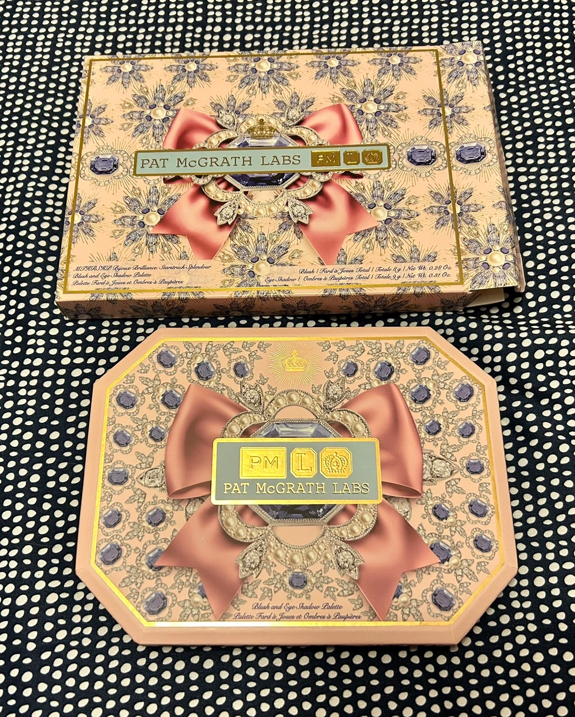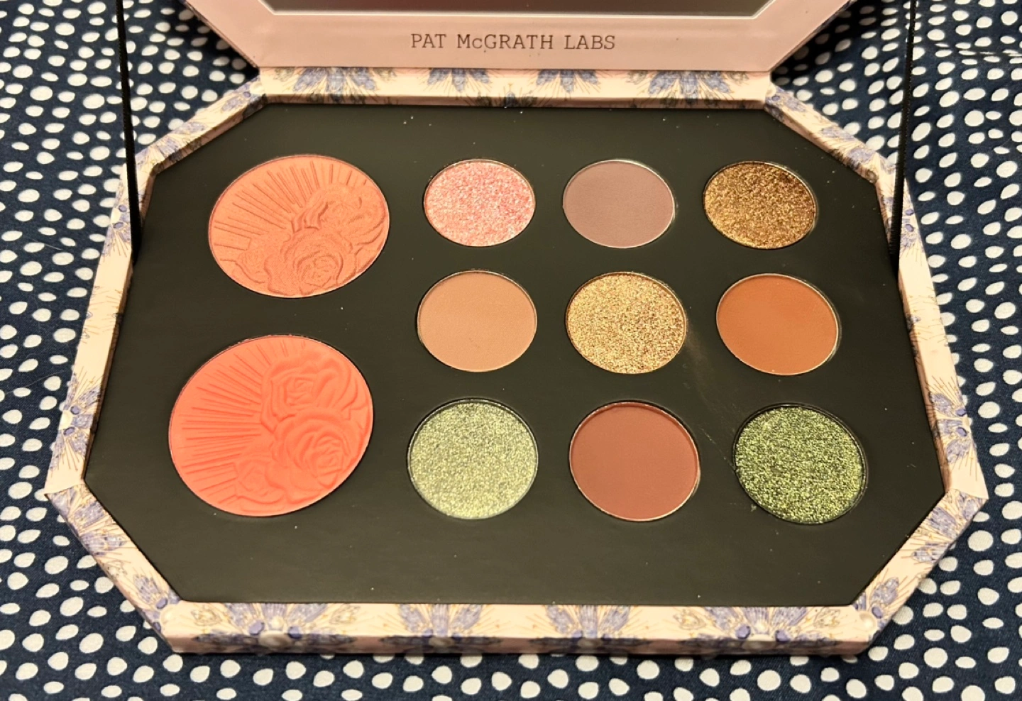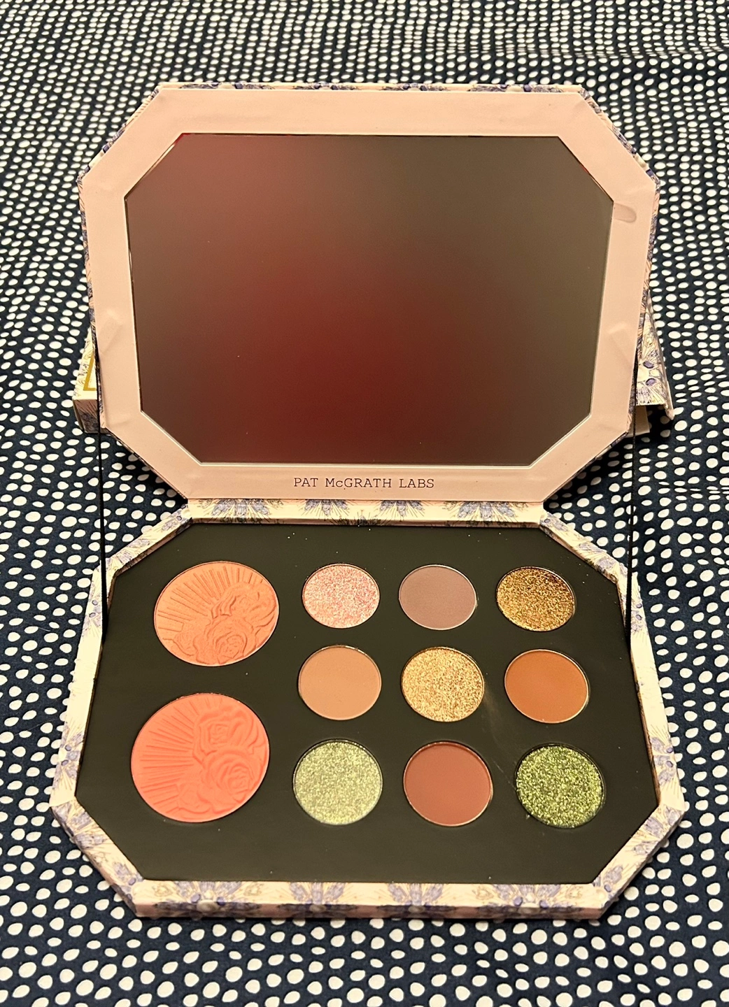 Gorgeous eyeshadow and blush palette. Beautiful design. Includes various shades of eyeshadow and two blush shades. Compact with mirror. New, unused. Pick up location Northeast Burlington Intersection Appleby line and Dundas Contact free porch pick up Smoke free home 😊