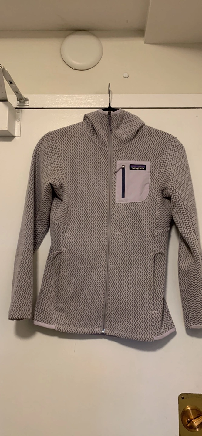 Selling a cozy Patagonia R1 fleece jacket! It's in great condition and perfect for layering on chilly days. Features a full zip and a handy chest pocket. The colour is a lovely light grey with a patterned design. Paid 239.00 plus taxes