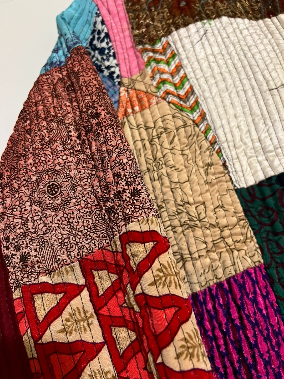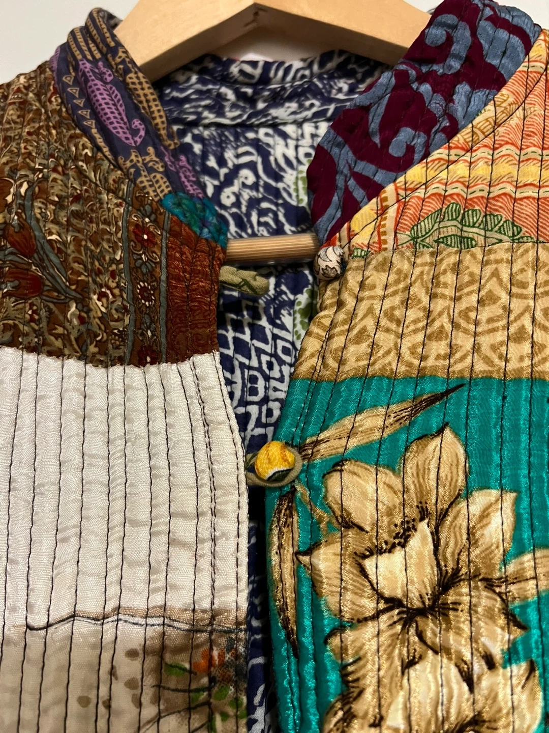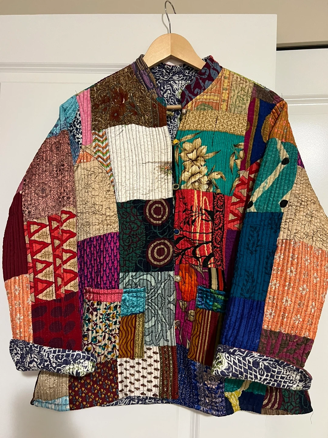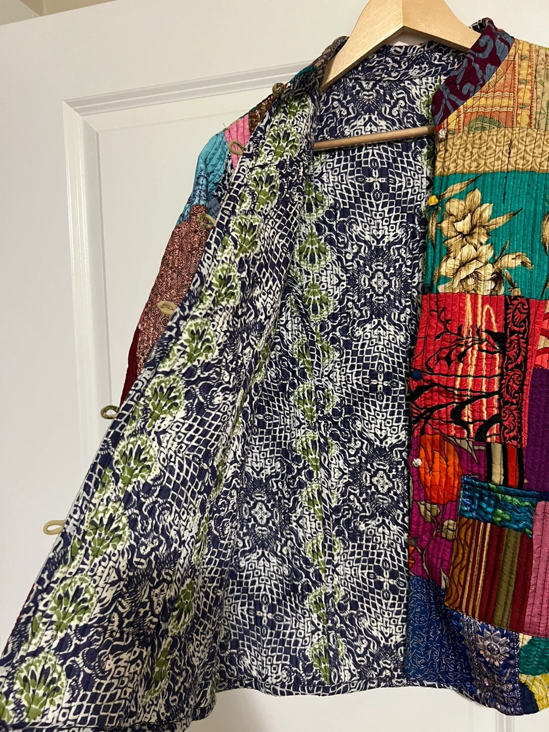 This is a beautiful patchwork quilted jacket! It's very colourful and unique, perfect for adding a pop of fun to your wardrobe. The jacket is in good condition and ready for a new home. It is made of a silk and cotton, making it a one-of-a-kind piece