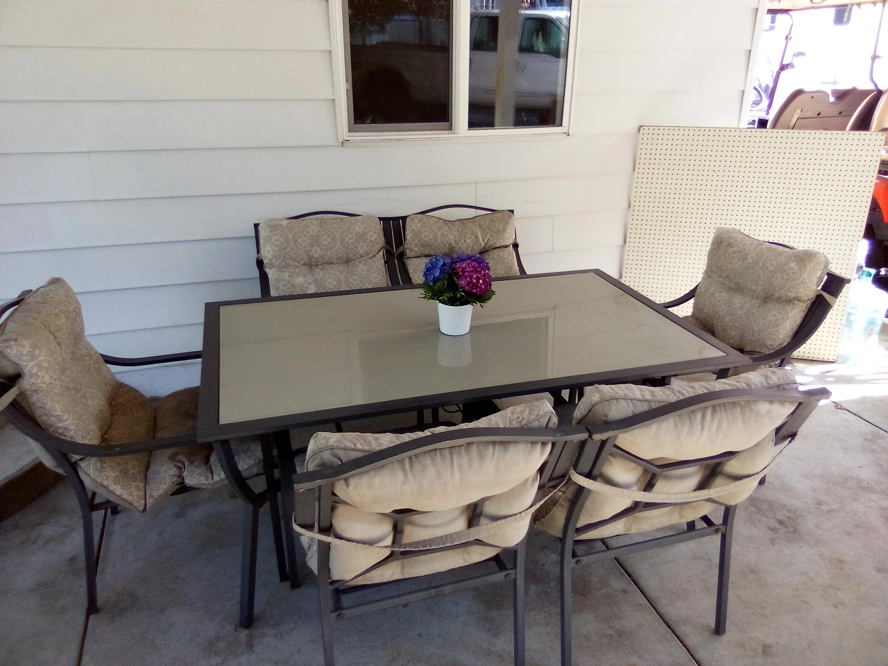 Looking to sell this patio set which includes a table and six chairs. The set is in good condition and perfect for enjoying the outdoors with family and friends. The cushions are a neutral colour, and the table has a glass top.