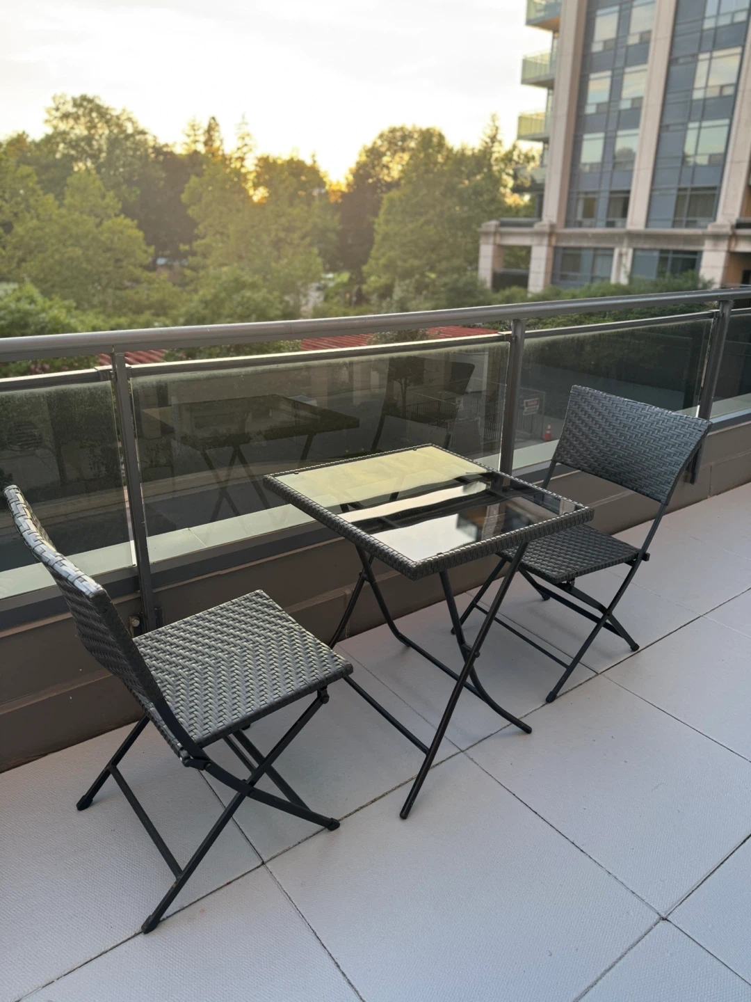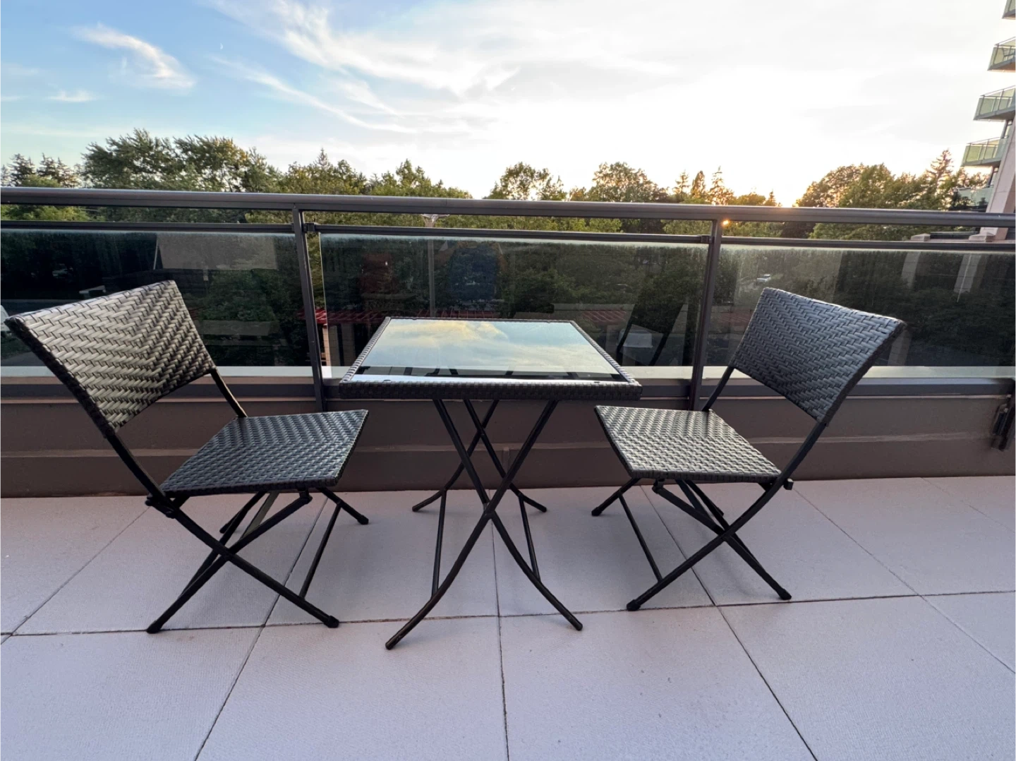 Looking to sell a patio set that includes a folding table and two folding chairs. It's perfect for a small balcony or deck. The set is in great condition and ready for a new home!
