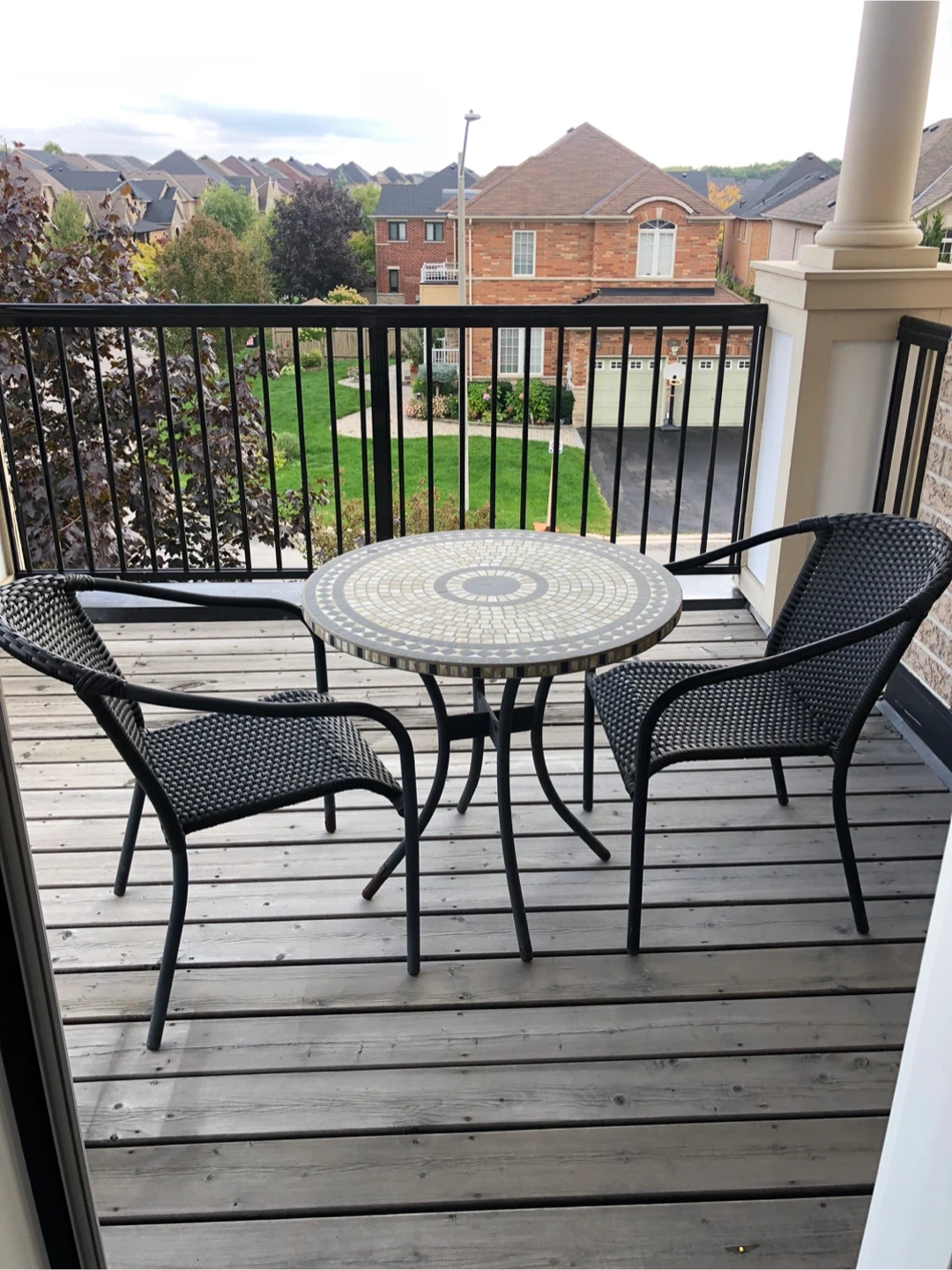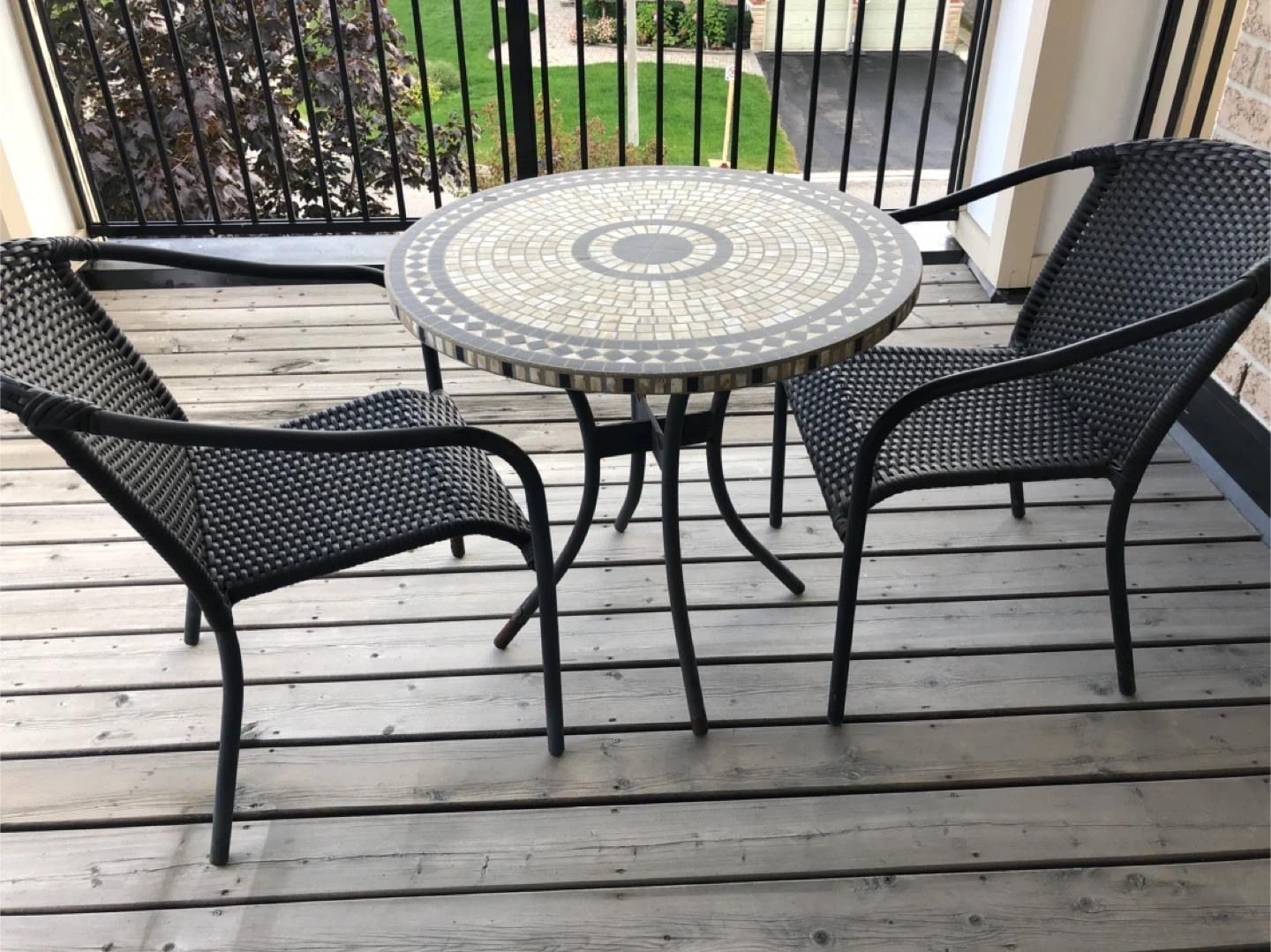 Patio table and chairs set in okay condition. The paint on the lower part of the metal leg is slightly peeling off. Perfect for a small balcony or patio space. The table has a mosaic pattern on top and the chairs are a black wicker style. Ready for pick up!