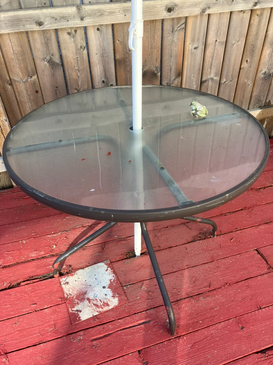 Selling a patio table with a glass top and metal frame. It has a hole in the centre for an umbrella. The table is in used condition.
