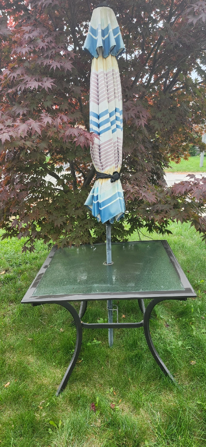 Selling a patio table with an umbrella. It's perfect for enjoying the outdoors. The table features a glass top and a sturdy metal frame. The umbrella provides shade on sunny days.