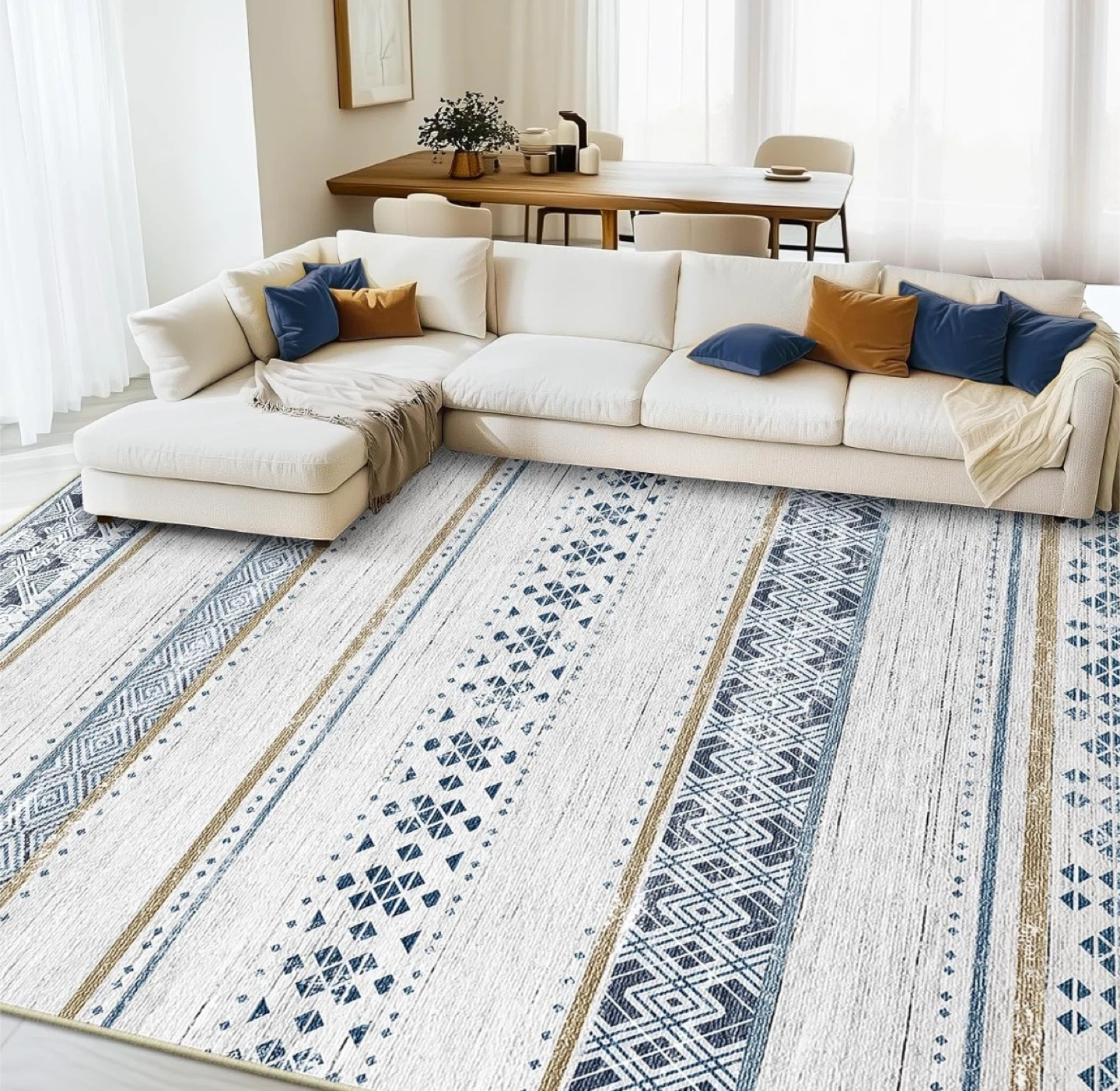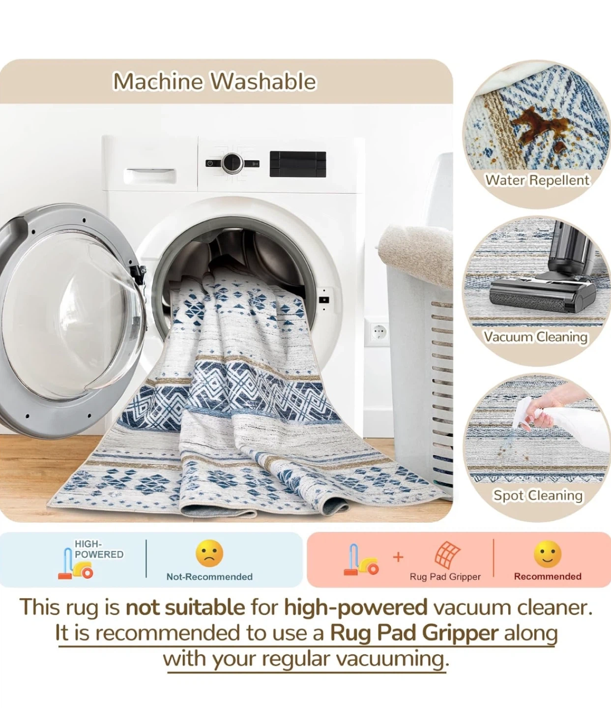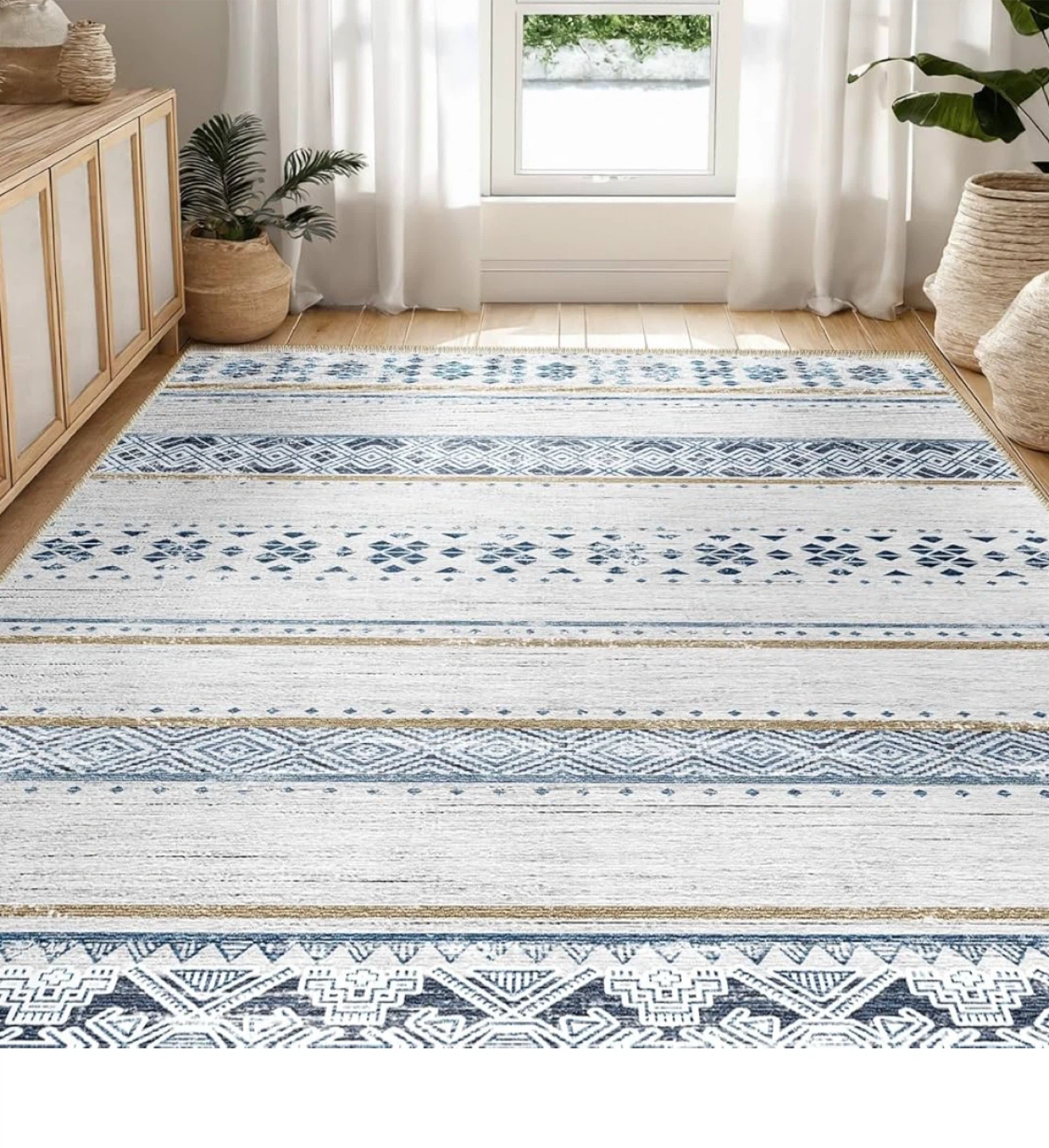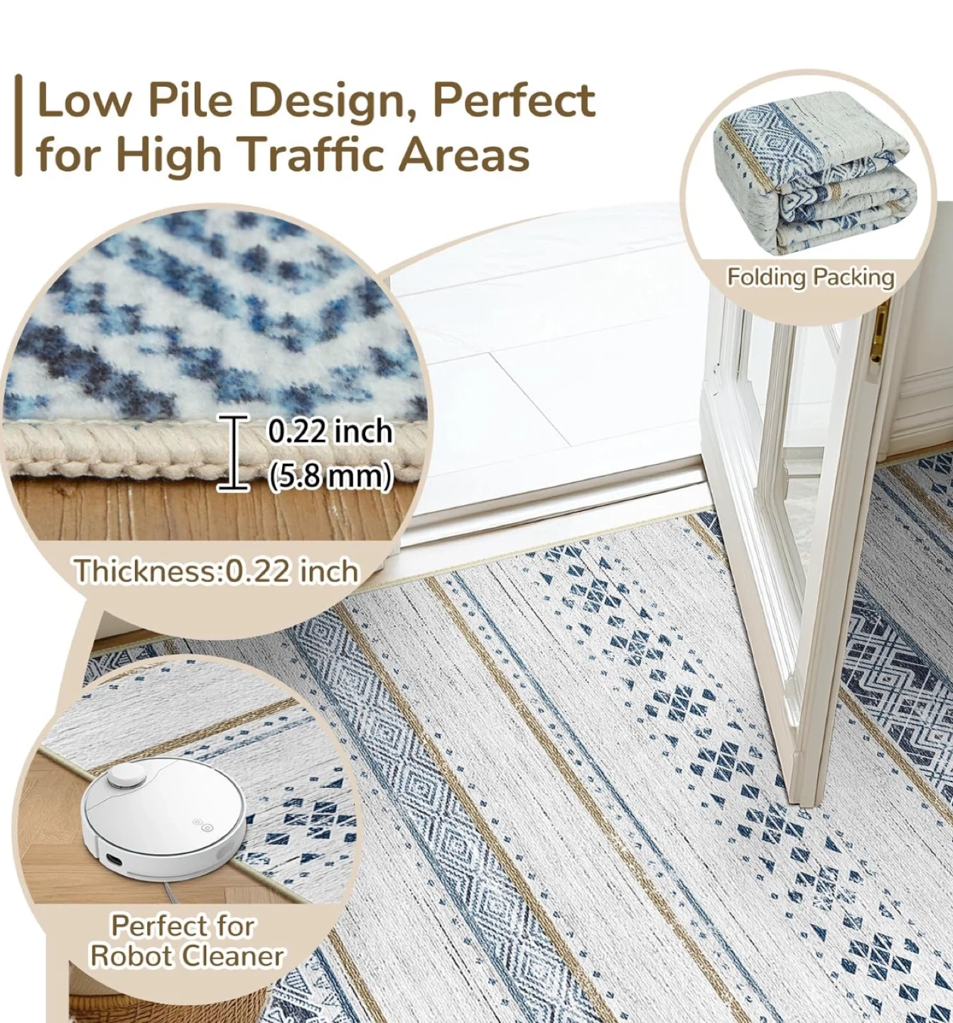 This is a lovely area rug, perfect for adding a touch of style to any room! It features a low pile design, making it ideal for high-traffic areas and easy to clean with a robot vacuum. The rug is machine washable and has a non-slip TPR backing for added safety. It's also water-repellent and has reinforced edges for durability.