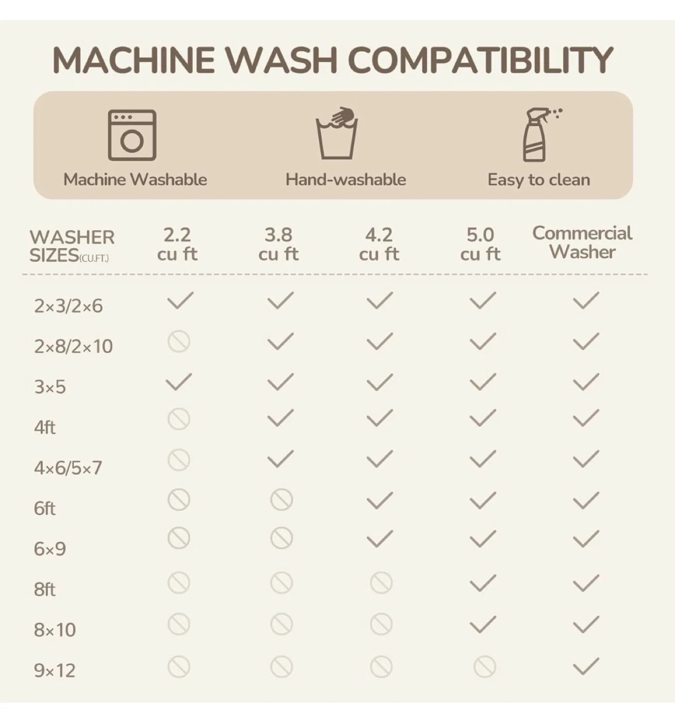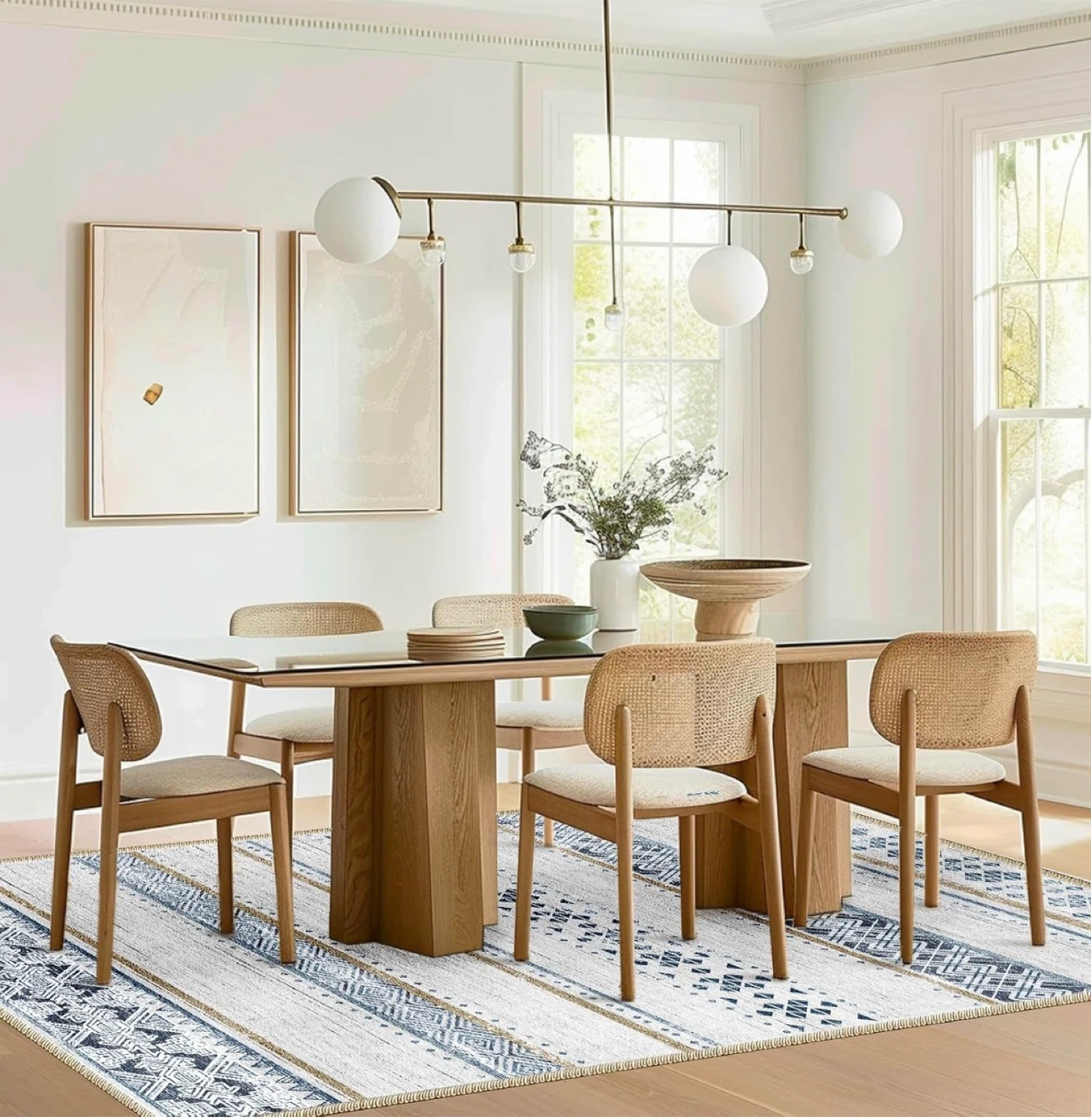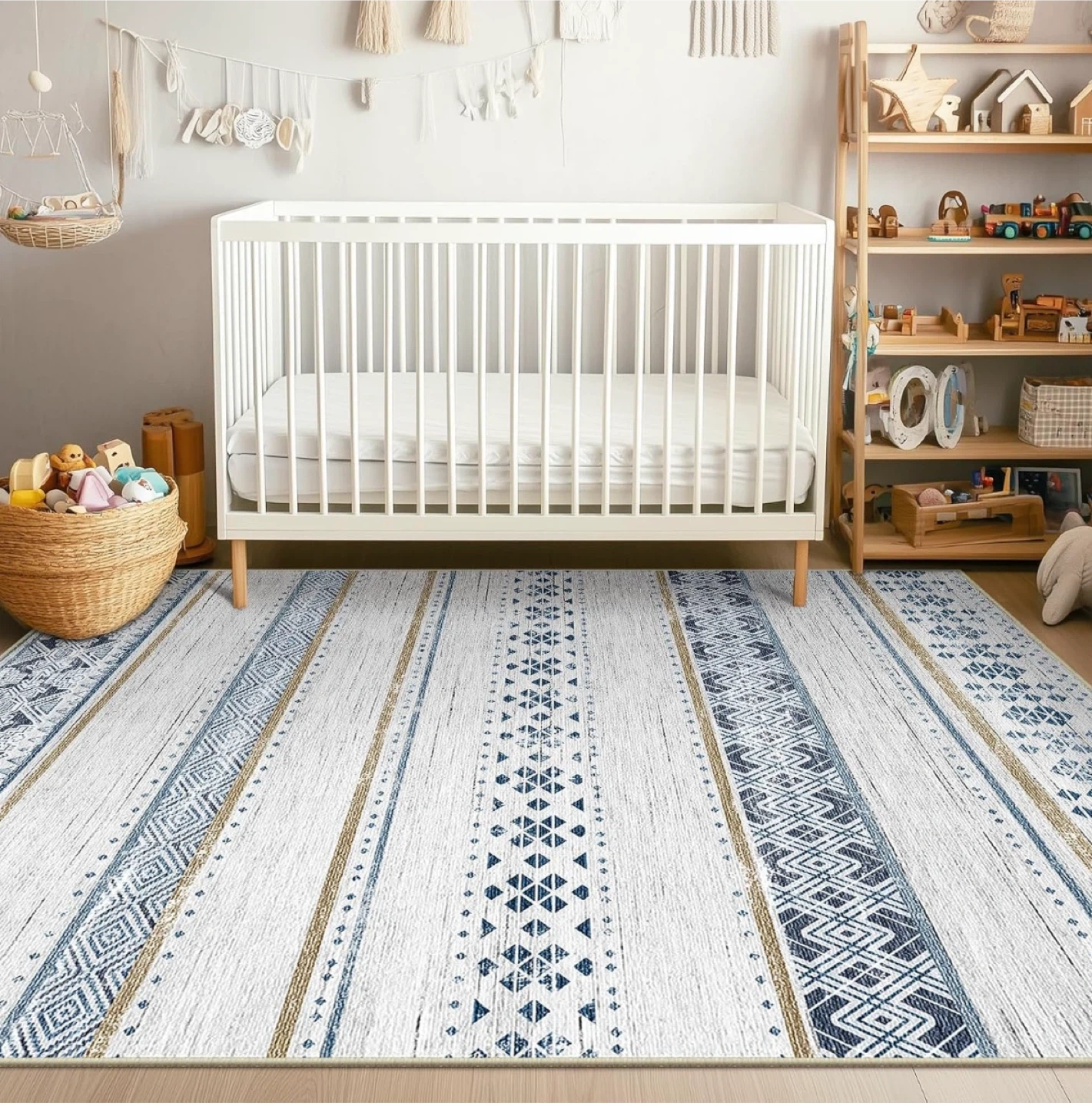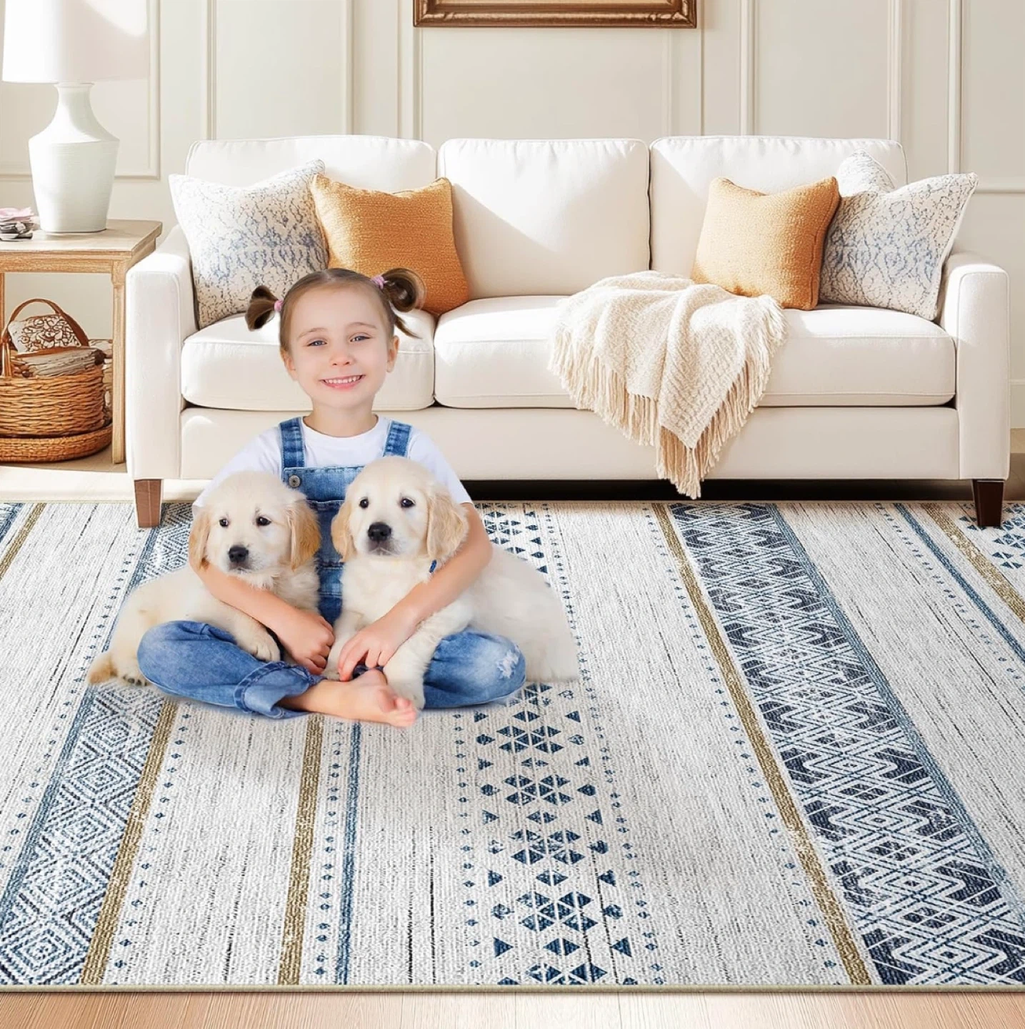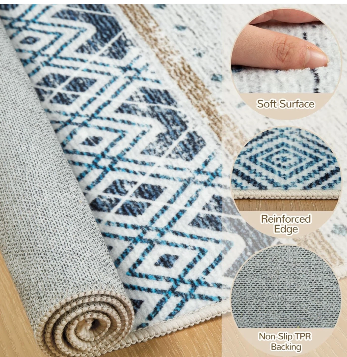 This is a lovely area rug, perfect for adding a touch of style to any room! It features a low pile design, making it ideal for high-traffic areas and easy to clean with a robot vacuum. The rug is machine washable and has a non-slip TPR backing for added safety. It's also water-repellent and has reinforced edges for durability.