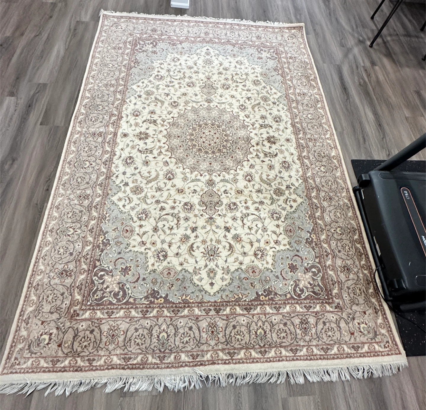 Selling a patterned area rug. It has a detailed design with floral and geometric motifs in neutral tones. The rug appears to be in good condition and would be a nice addition to any room