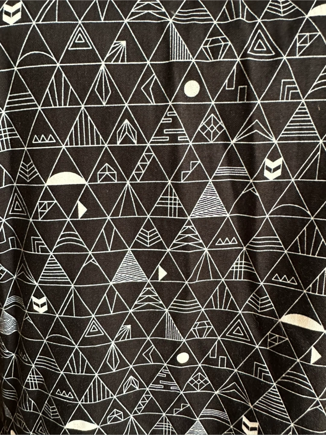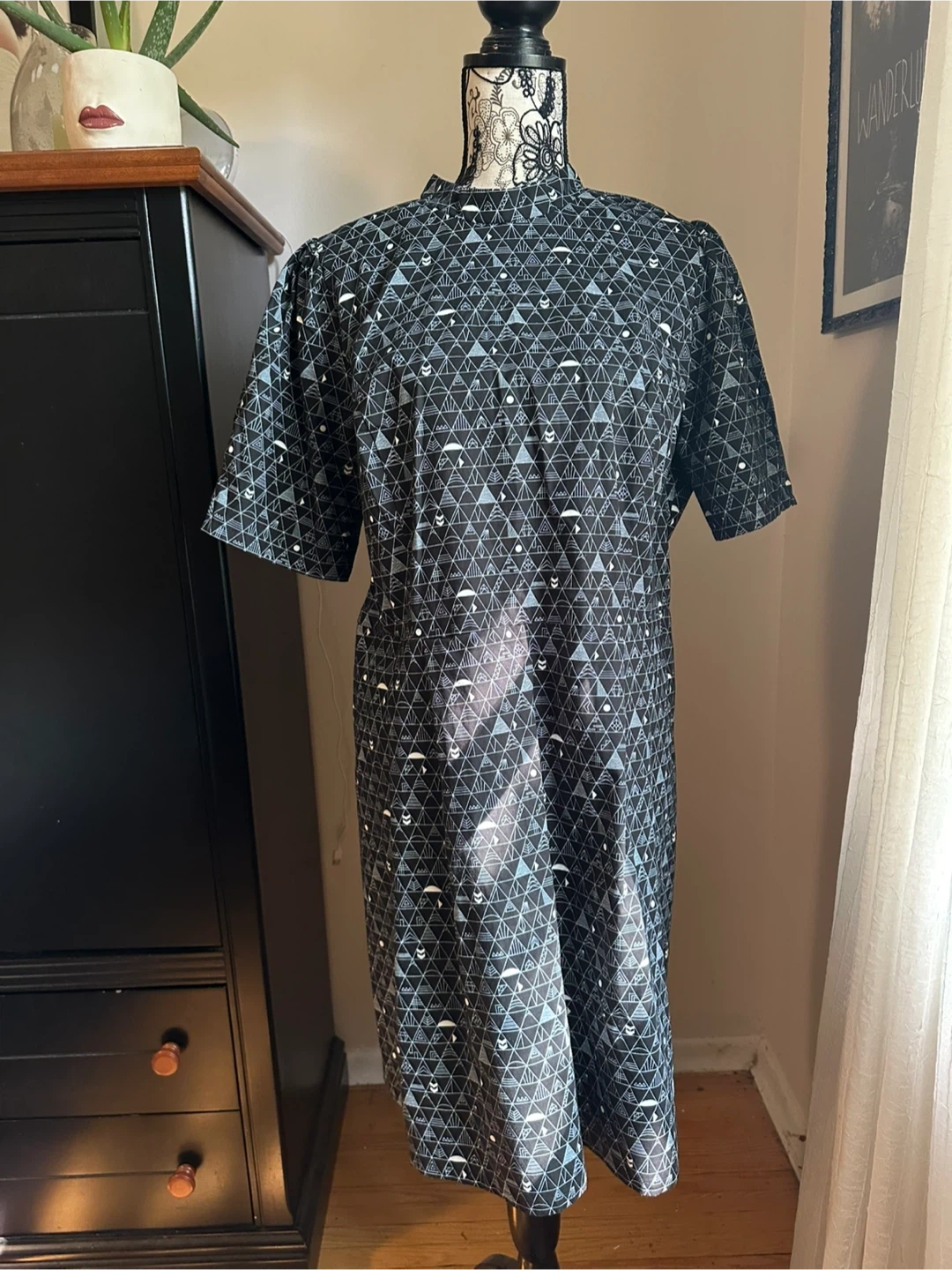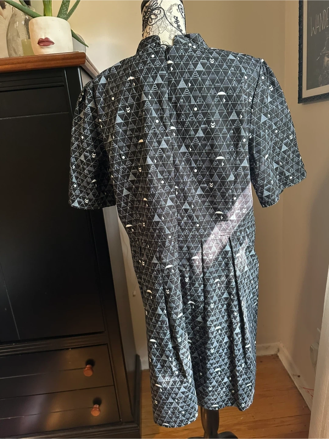 Here's a fun patterned dress! It's black with white geometric designs. It's in great condition and ready for a new home
