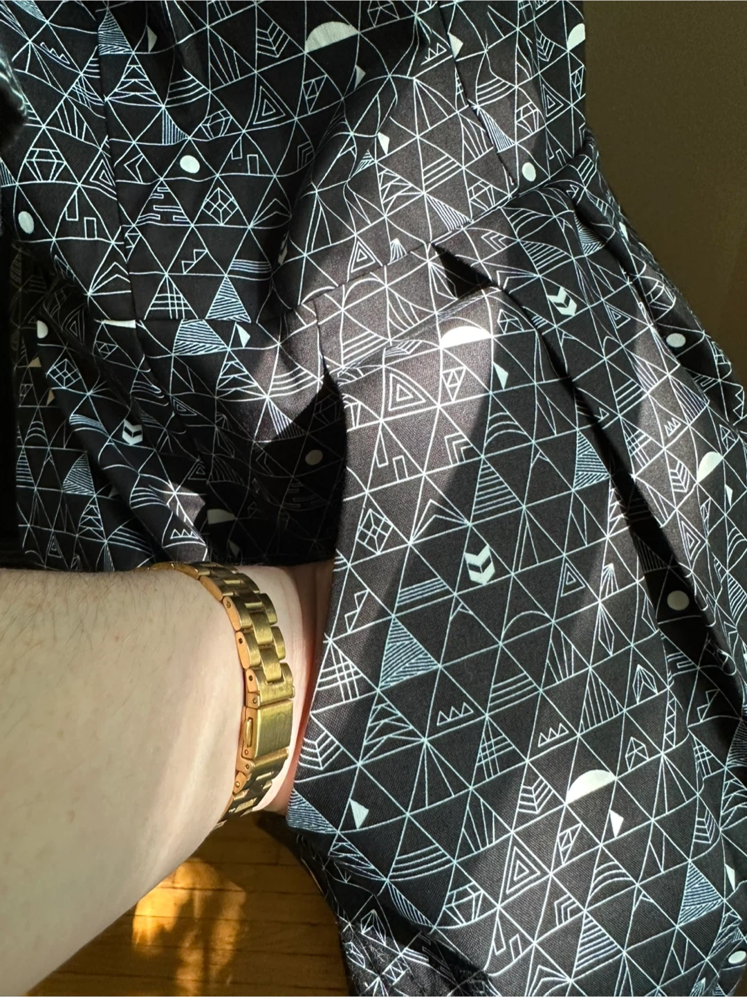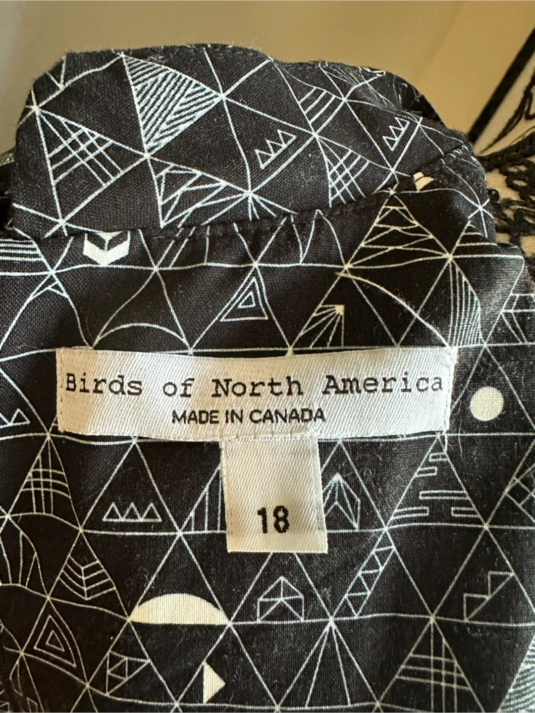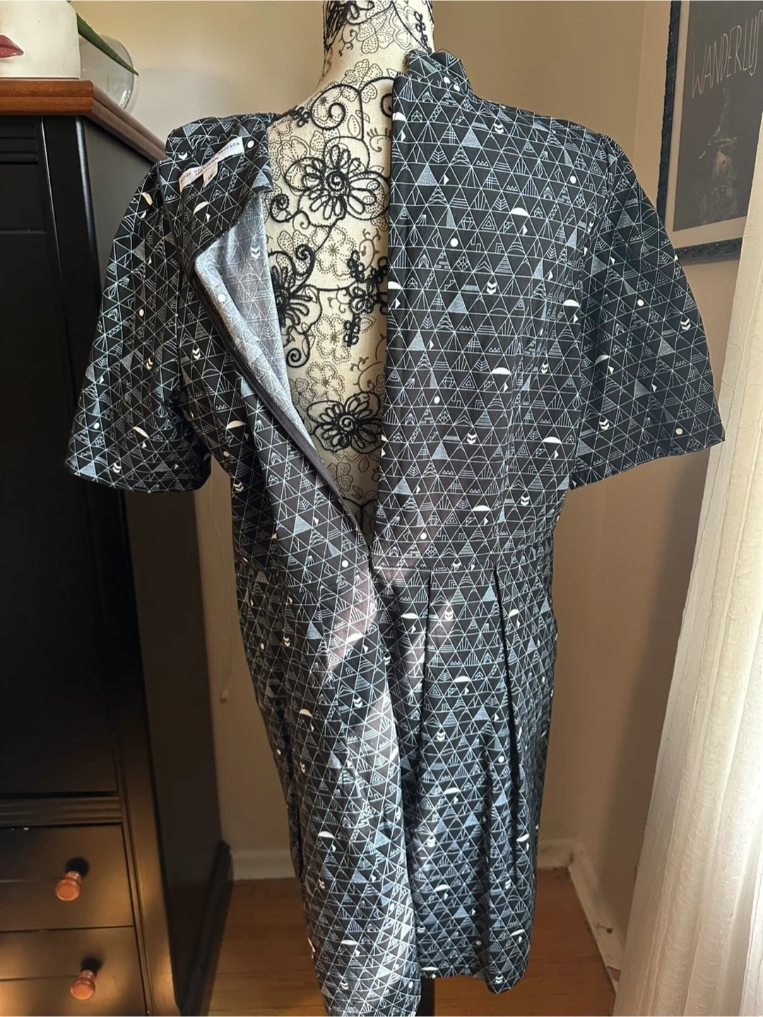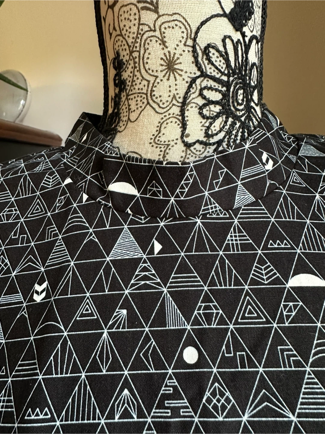 Here's a fun patterned dress! It's black with white geometric designs. It's in great condition and ready for a new home