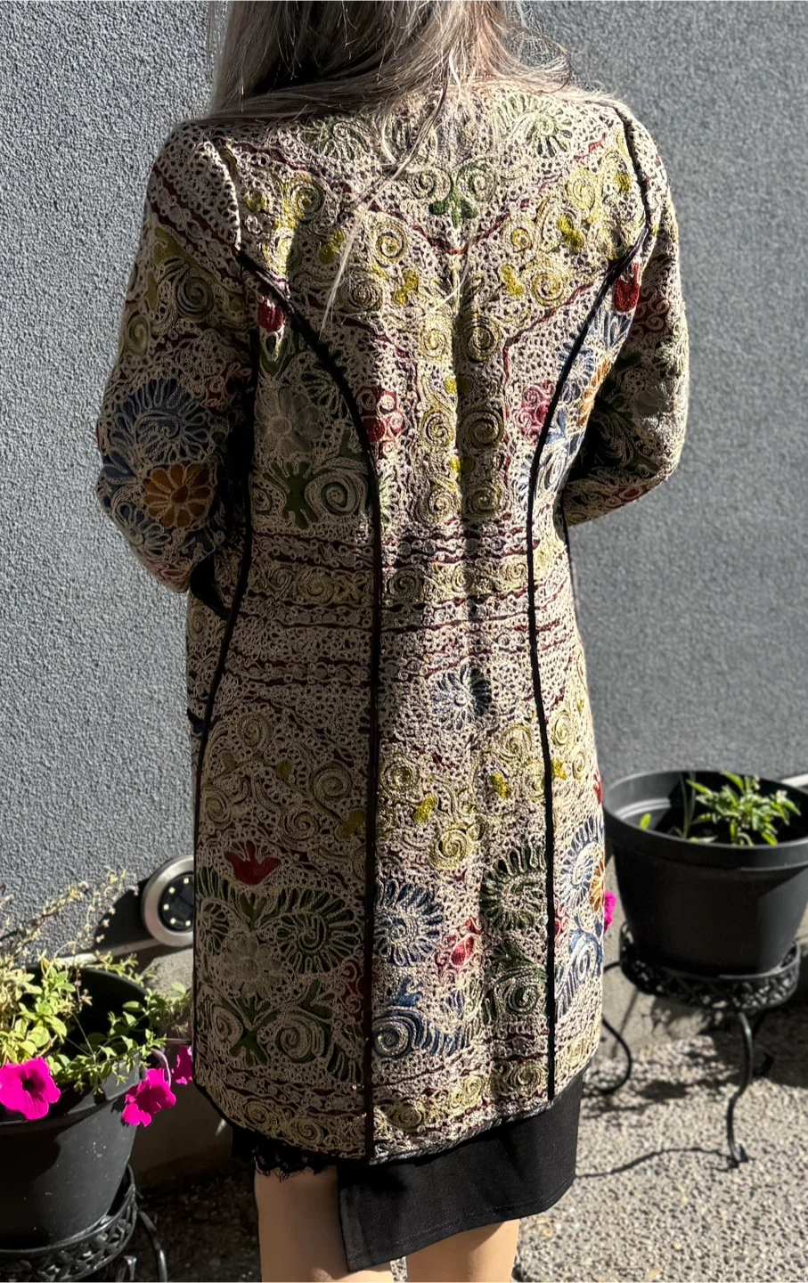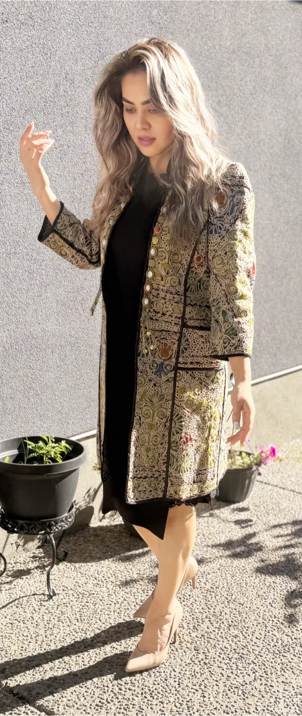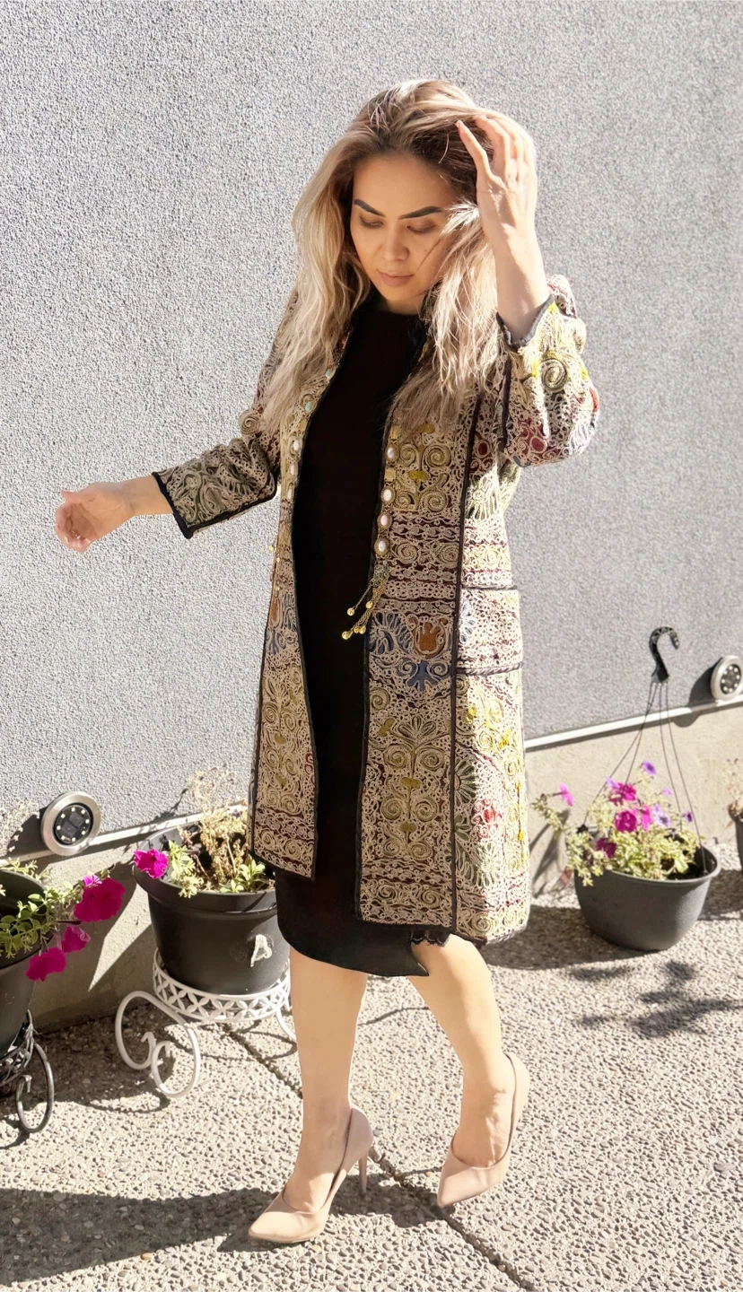 Selling a unique patterned coat. It has a beautiful and intricate design. Perfect for adding a touch of elegance to any outfit! Size medium available