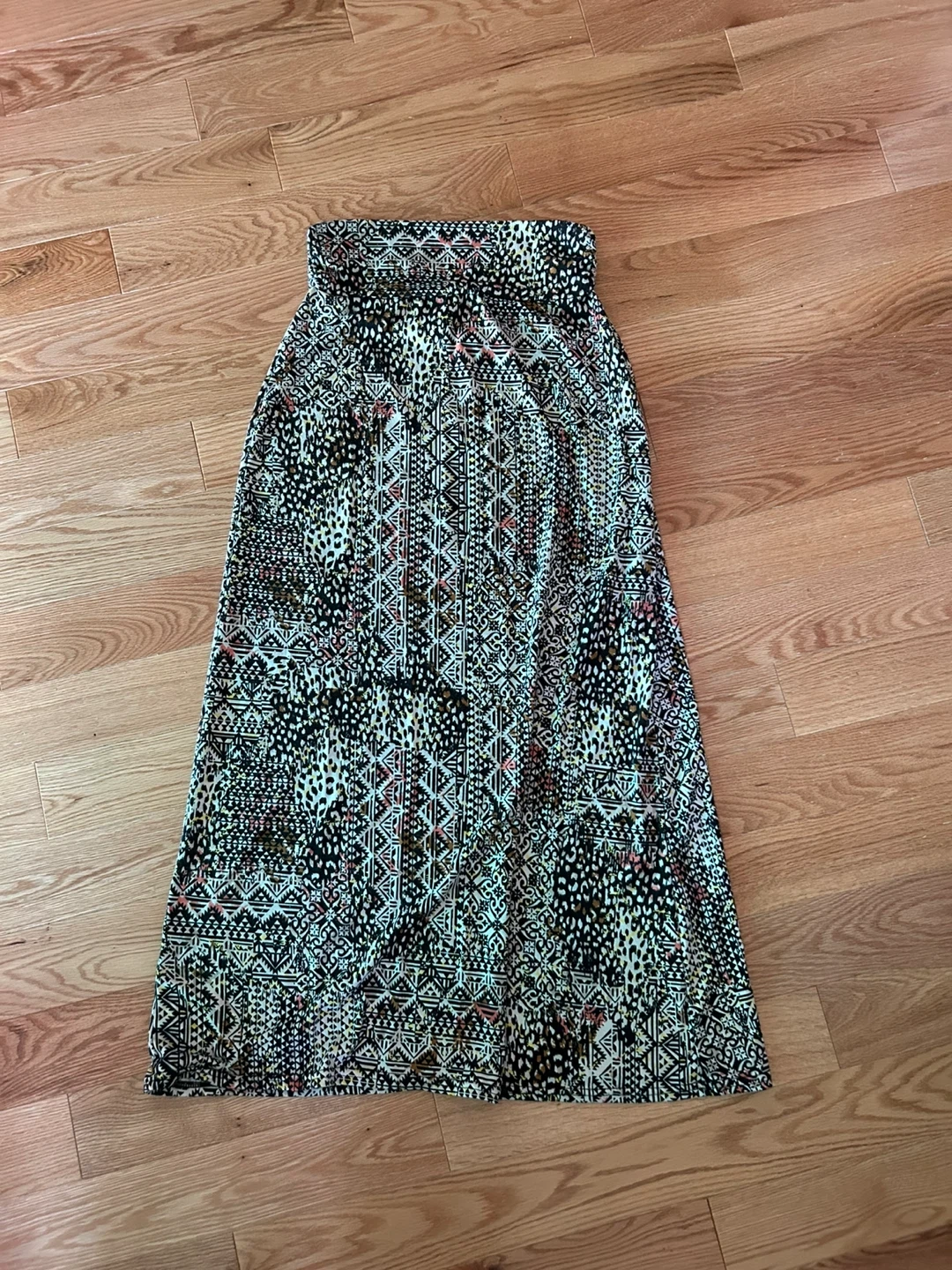 This is a comfortable maxi skirt with a unique patterned design! It's perfect for a casual day out or dressing up for a summer evening.