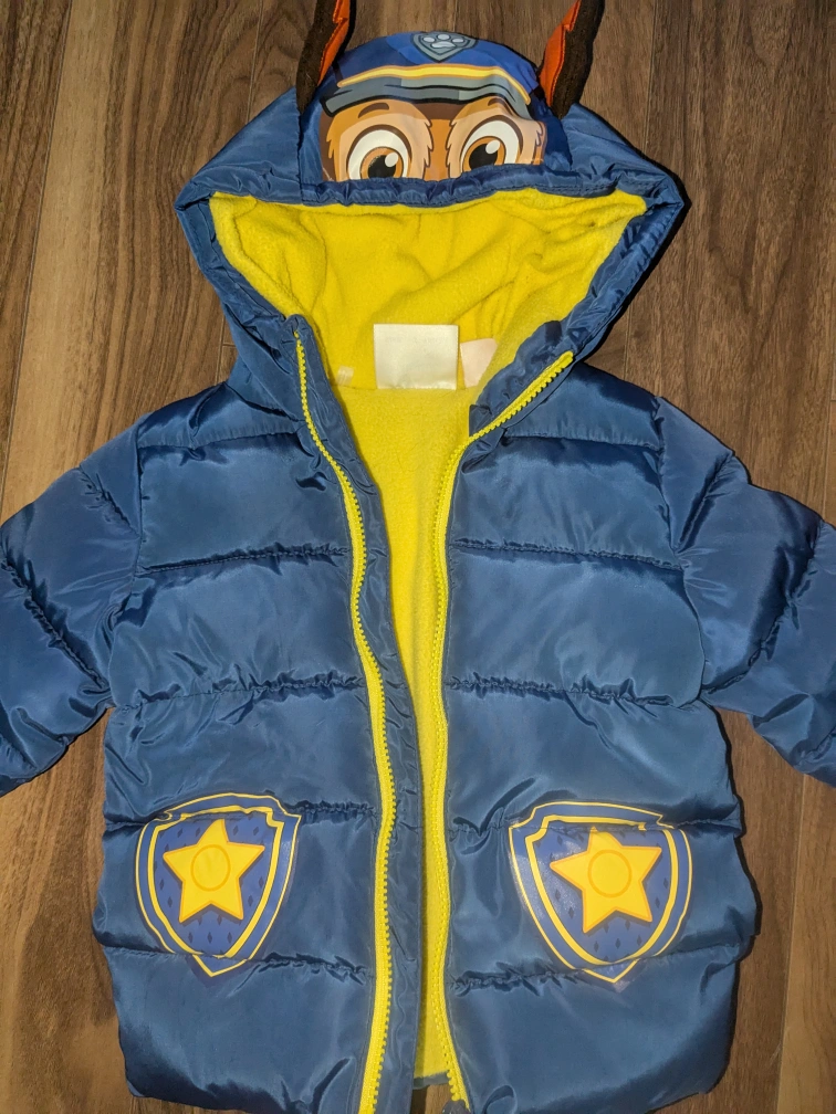 A super cute Paw Patrol puffer jacket featuring Chase! It’s a blue puffer jacket with a yellow lining and Chase's face on the hood. Perfect for keeping your little one warm and stylish.