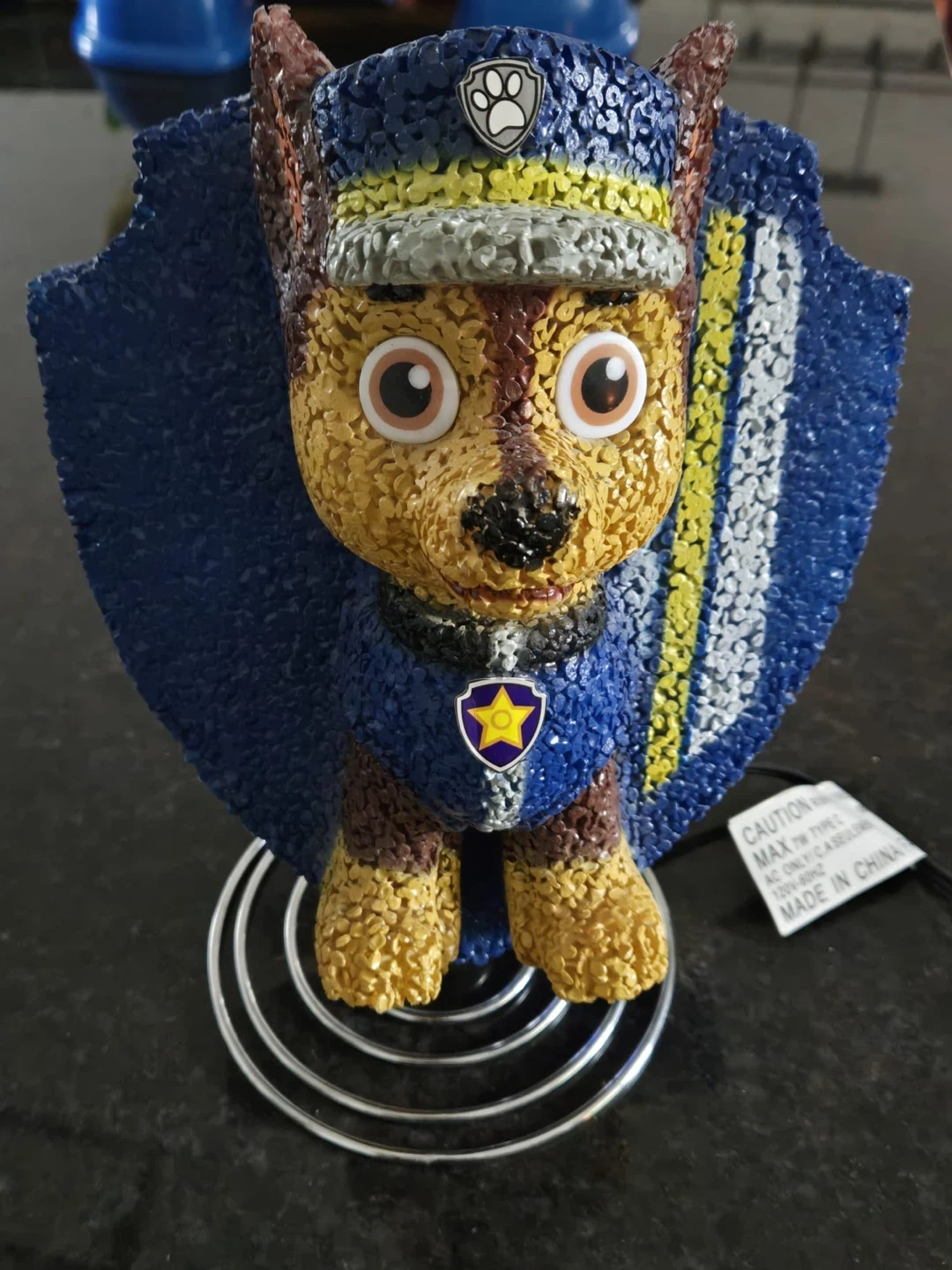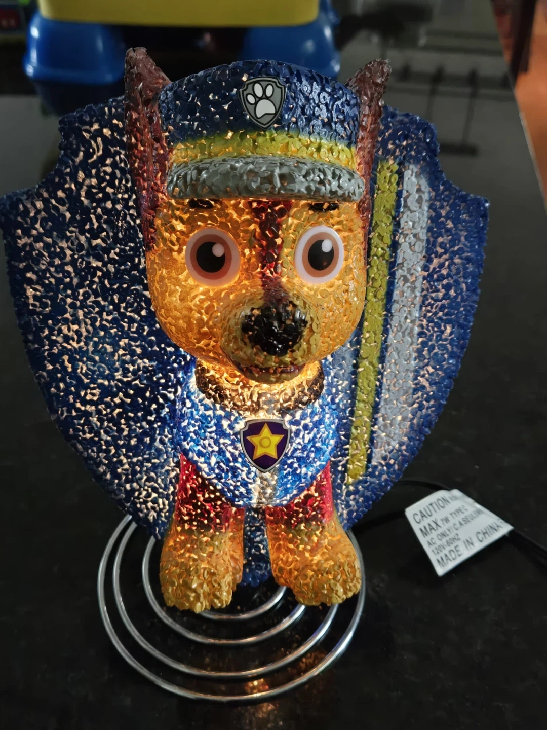 Here's a cute Paw Patrol Chase table lamp! It's in great shape and ready to light up a kiddo's room. It features Chase, the police dog, in his uniform. Perfect for any Paw Patrol fan!