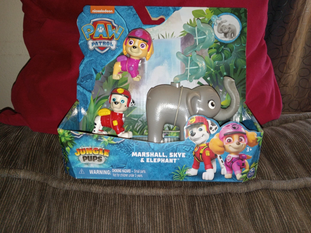 New Paw Patrol Jungle Pups playset. Features Marshall, Skye, and an elephant figure. Great for imaginative play.
