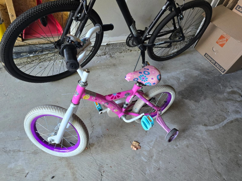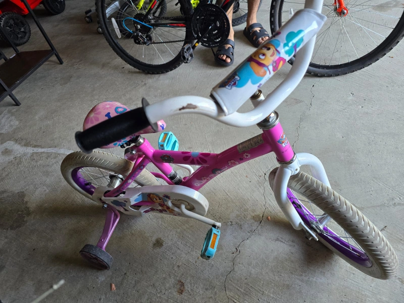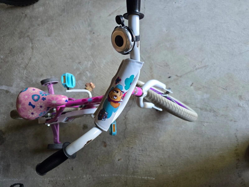 Selling a cute Paw Patrol themed kids' bike! It's pink and purple, perfect for any little Paw Patrol fan. It has some wear and tear but is still in good working condition. Great for learning to ride!
