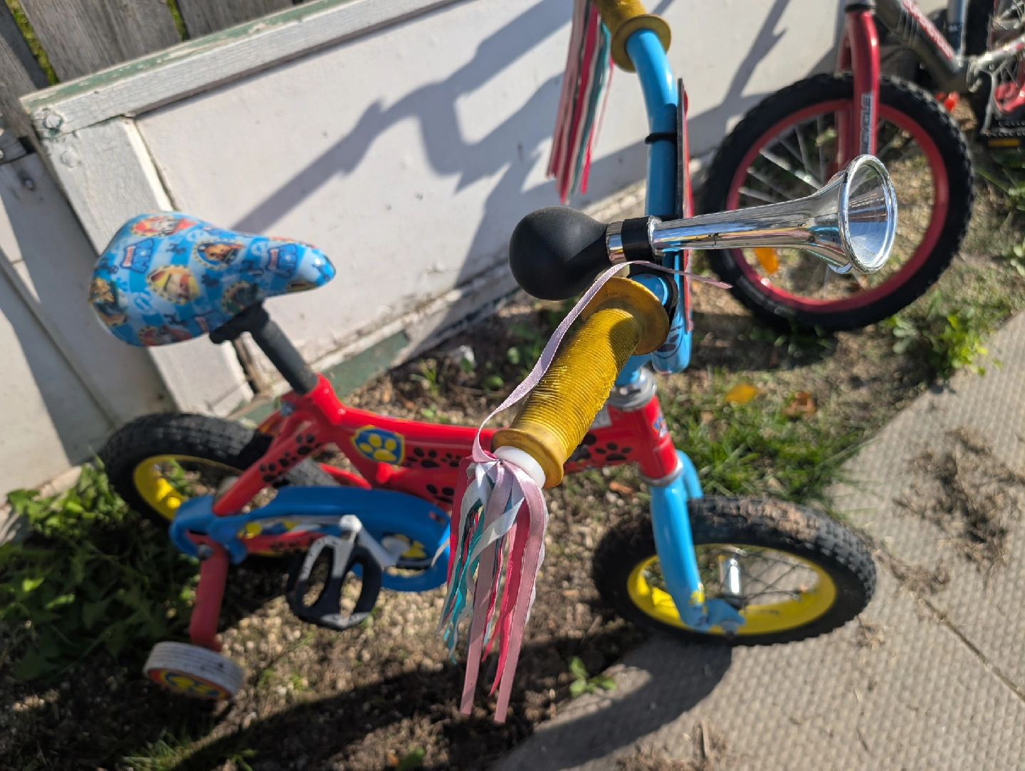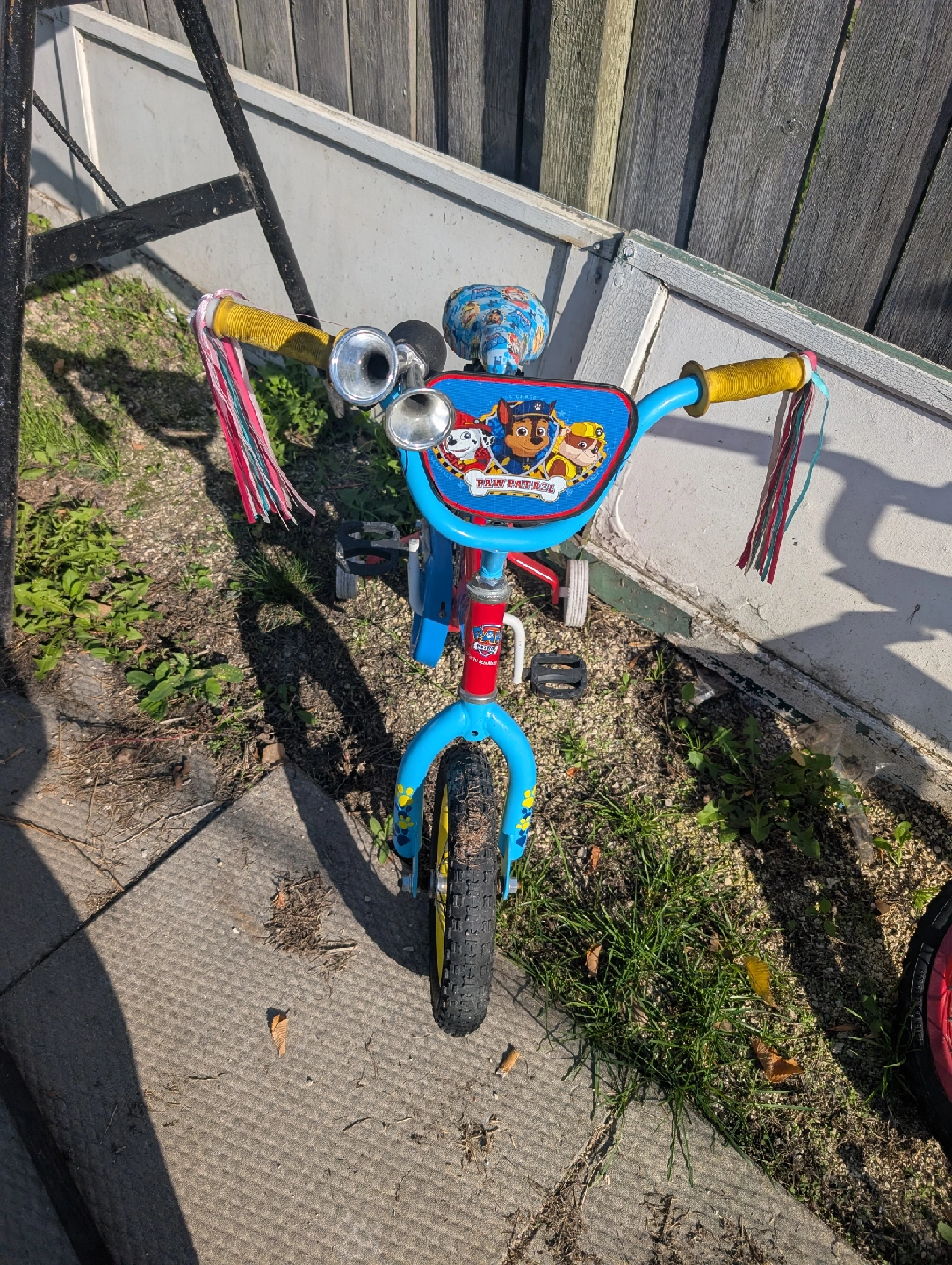 Selling a cute Paw Patrol themed kids' bike! It's perfect for little ones learning to ride. Features a colourful Paw Patrol design and comes with training wheels. The bike also has a fun horn and decorative streamers on the handlebars asking $150 obo
