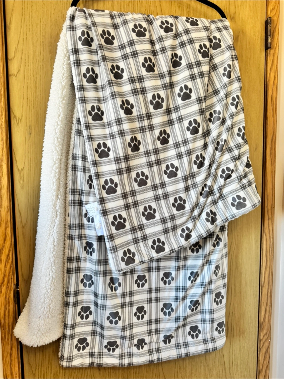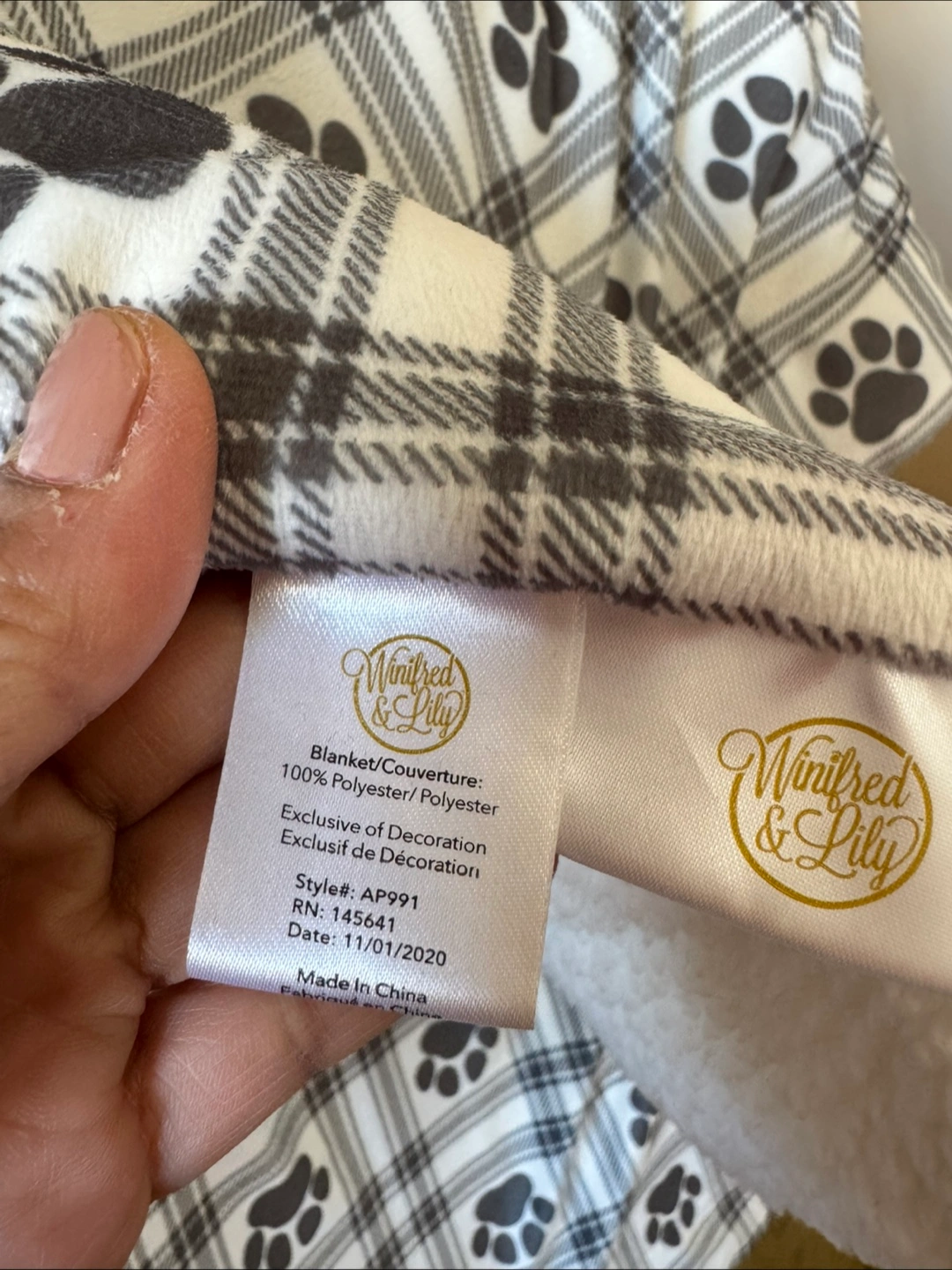 Snuggle up with this cozy blanket from Winifred & Lily! It features a cute paw print design on a plaid background and is made of 100% polyester. The blanket has a soft, sherpa-like backing for extra warmth and comfort