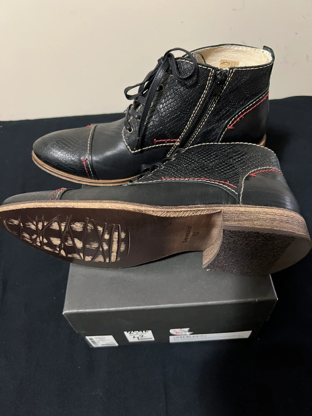 Pawker black leather ankle boots in size 9,5. These boots feature a unique snakeskin-like texture on the upper part and stylish red stitching details. No original box. Made in Portugal