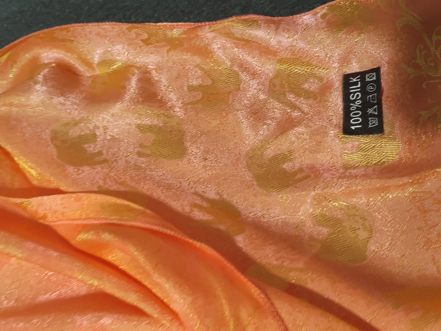 Beautiful throw blanket with a peach and gold elephant print! It's in great condition and would be a lovely addition to any room. ๐ฏ Silk.