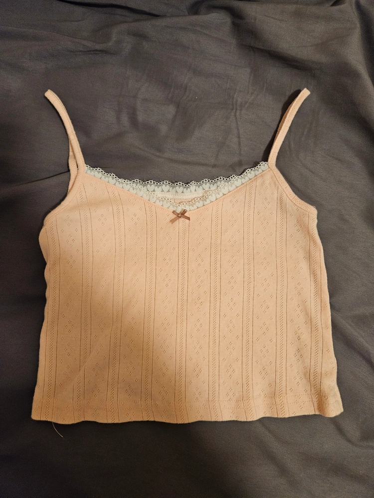 Adorable peach coloured crop cami top. Features delicate lace trim and a small bow detail. Knit fabric, ribbed texture. Lightweight and stretchy. Payment: Cash Meet up: Dovercourt park, ossignton dufferin station <3