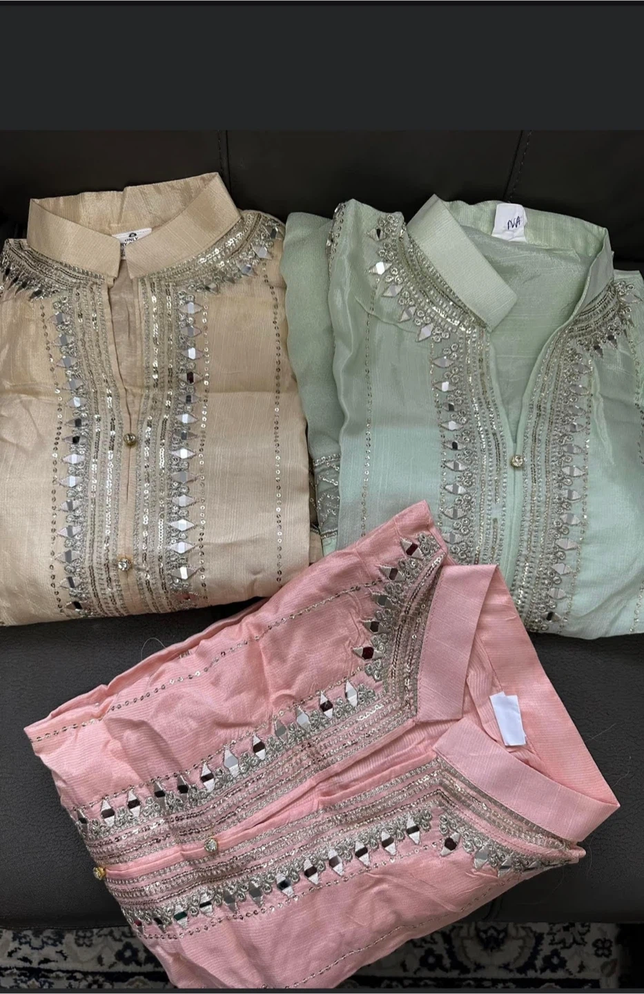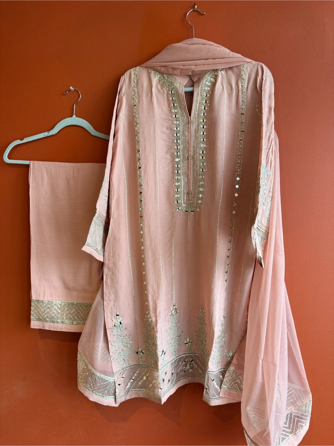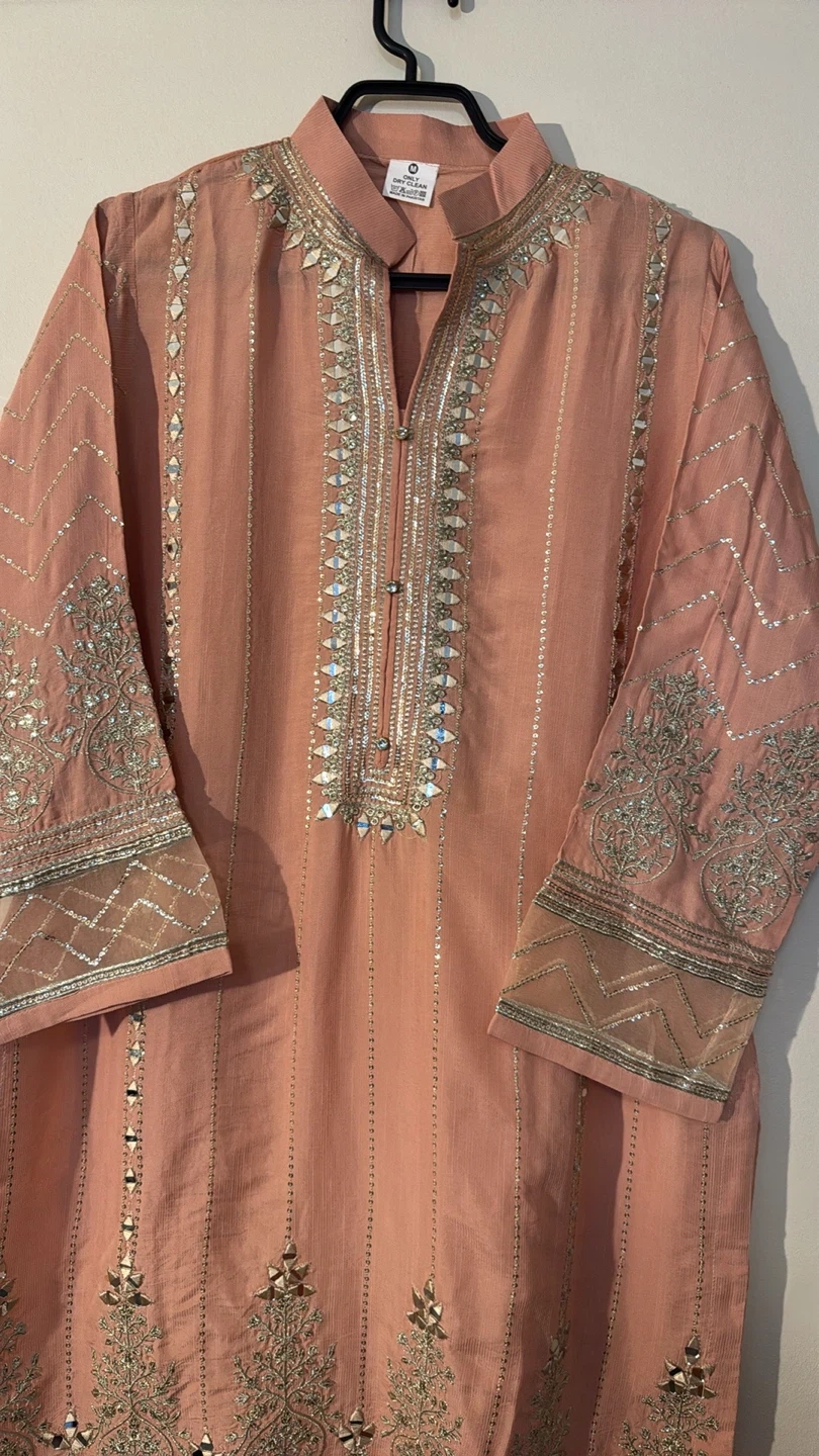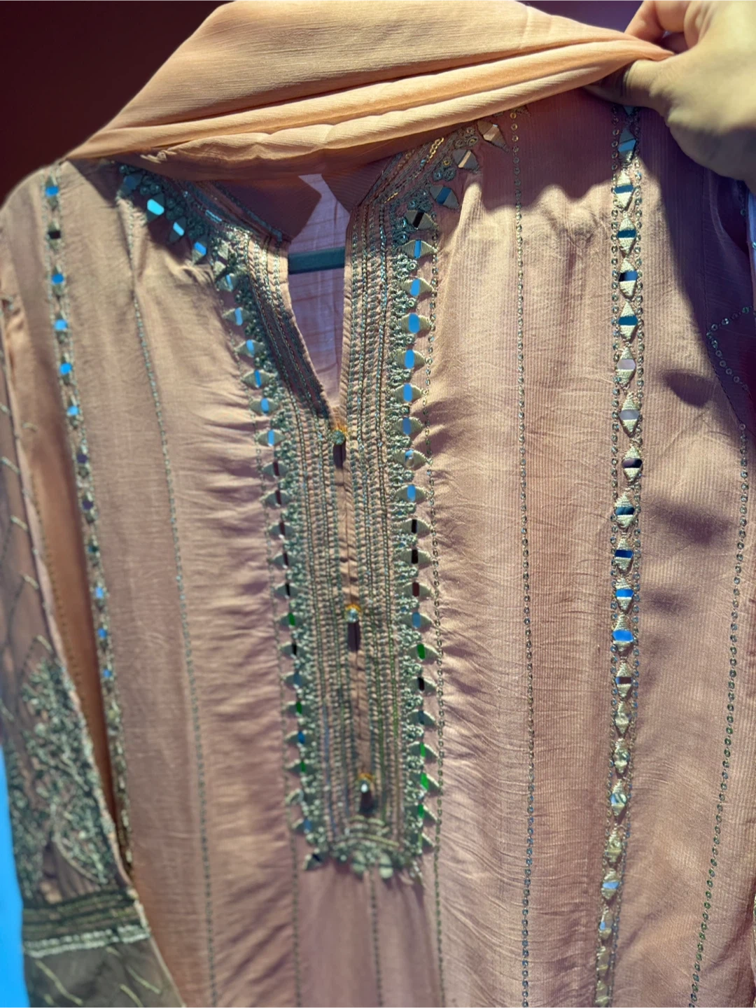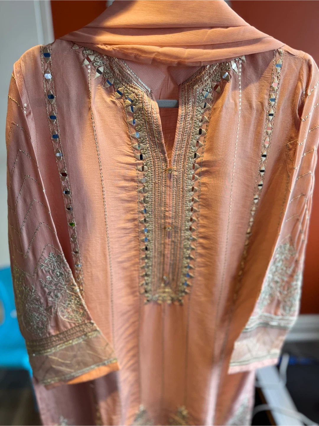 Selling a beautiful peach-coloured salwar kameez suit. It features intricate mirror work and embroidery. Perfect for a special occasion or a festive event! Chest 21 hip 23