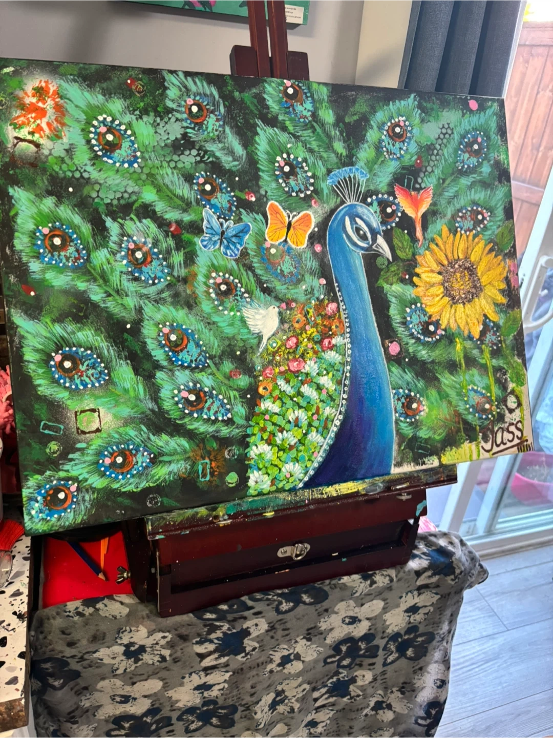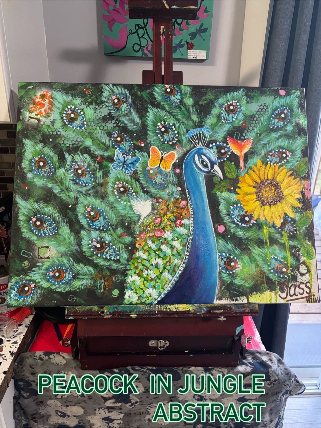 Freshly painted Abstract Peacock stunning artwork on canvas size 18” X 24” Title : Peacock Elegance Medium: Acrylics on canvas Year : 2025 Artist : Jaspreet Arneja