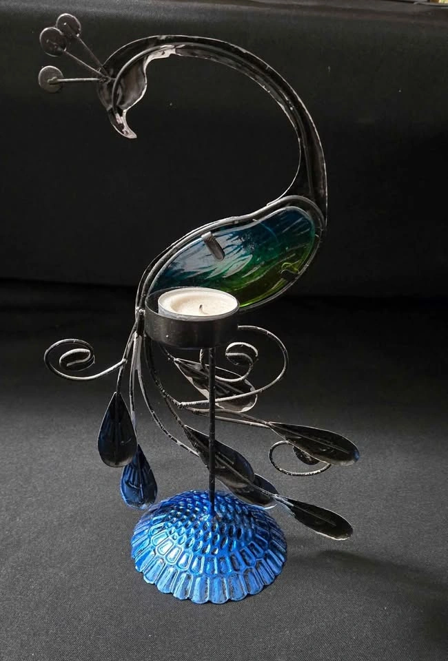 Beautiful peacock tealight candle holder with a colored glass belly. Beautiful when lit. Pickup Northside port coquitlam