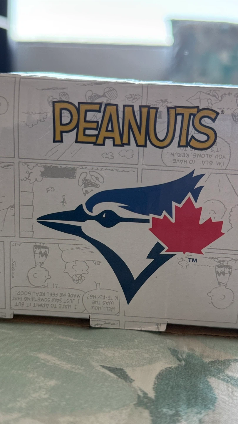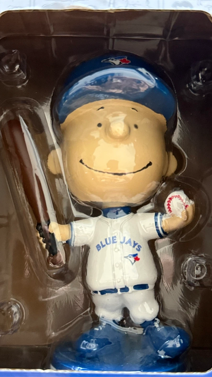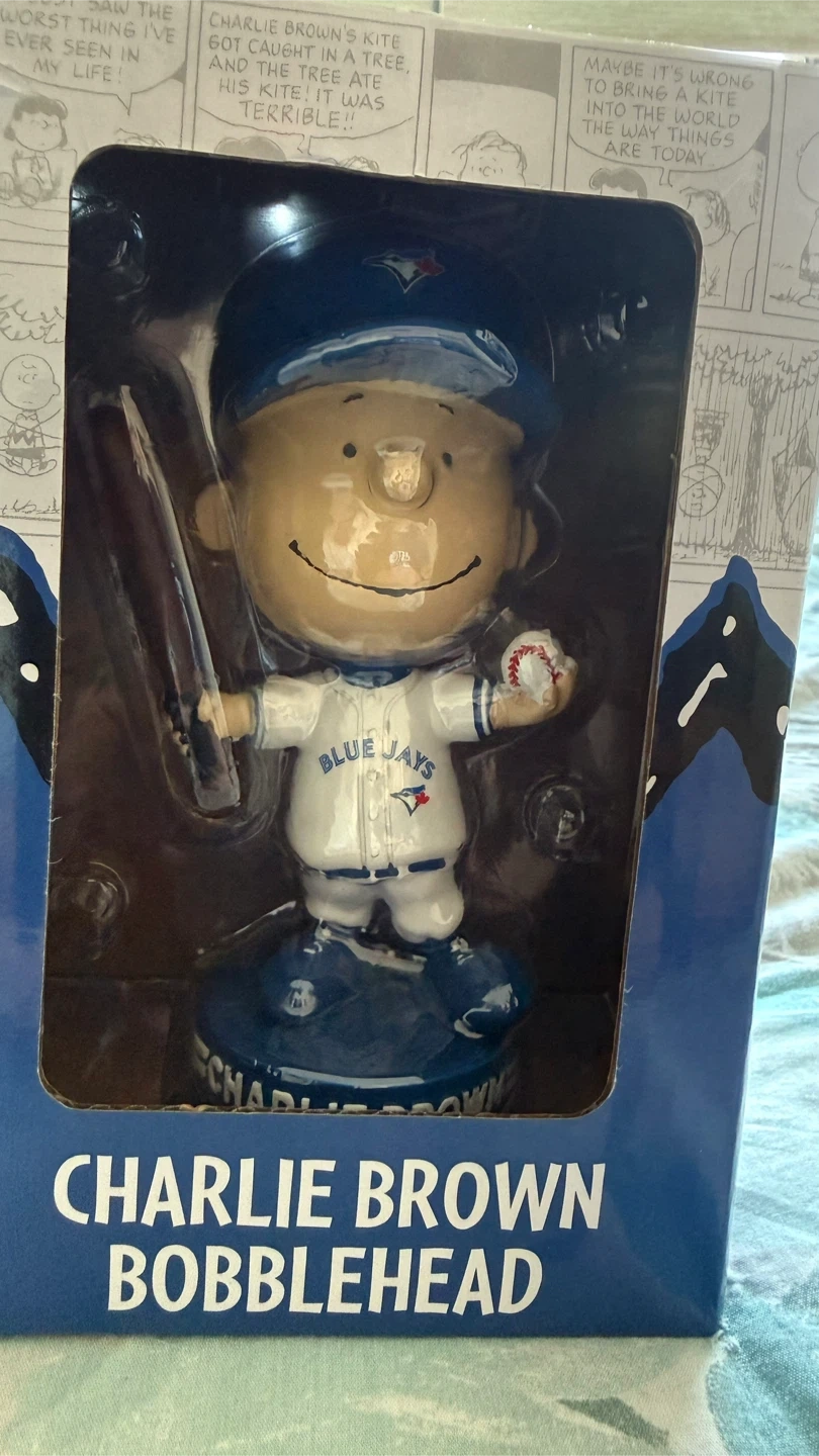 Selling a Charlie Brown bobblehead dressed in a Blue Jays uniform! It's in its original packaging, featuring Peanuts comic strips on the box. A fun collectible for any Peanuts or Blue Jays fan