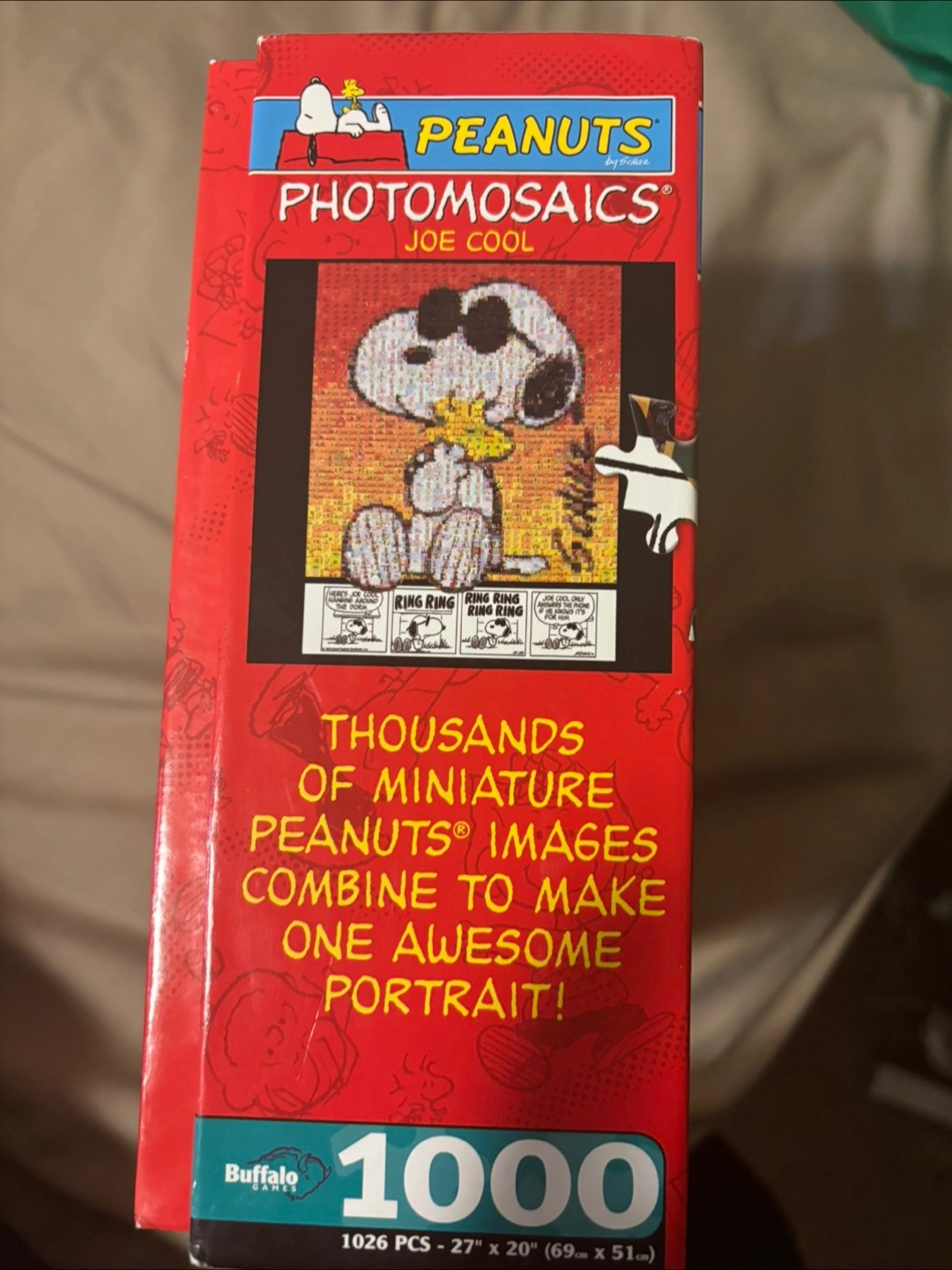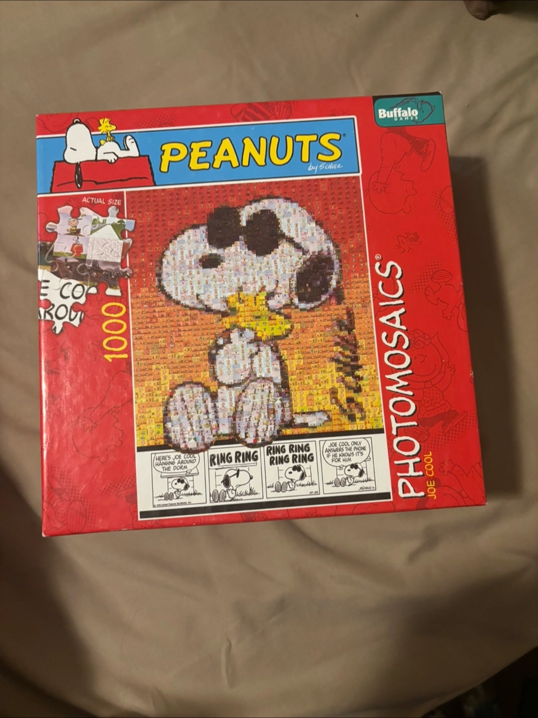 Selling a Peanuts Photomosaics Joe Cool puzzle by Buffalo Games! This puzzle contains 1000 pieces and creates one awesome portrait using thousands of miniature Peanuts images. The finished puzzle measures 27" x 20" (69cm x 51cm).
