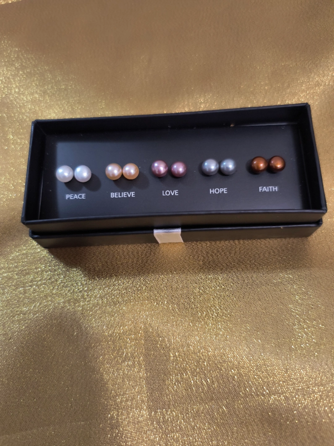 I'm selling a set of fresh water pearl earrings, each with a different word: Peace, Believe, Love, Hope, and Faith. They come in a variety of colours and are in excellent condition. Perfect as a gift or for yourself!