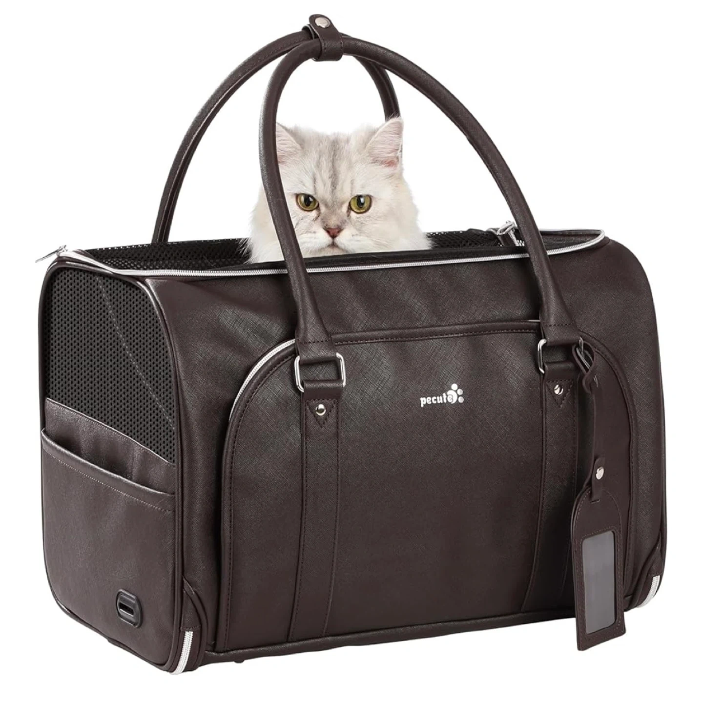 BRAND NEW Pecute Faux Leather Fabric Cat Carrier, Dog Carrier with Zipper Lock, Pet Carrier for Cats Small Dogs, for Traveling, Taking Public Transportation or Going to The Doctor) Colour: Dark Brown Height: 29cm/11.4" Width: 31cm/12.2" Length: 43cm/16.9" For Cats<7kg/15lbs For small Dog < 6kg/13.2lbs