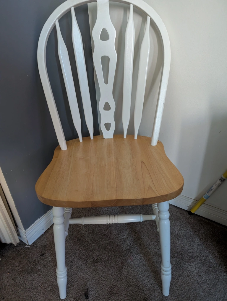 Selling a round dining table with a pedestal base, paired with 4 matching s and leaf extension! The table features a two-tone finish with a wood-toned top and a white base. The chair has a similar colour scheme, with a light wood seat and white frame. It's perfect for kitchen or dining area! and can be extended for large gatherings. PICKUP ONLY TEXT PREFERRED