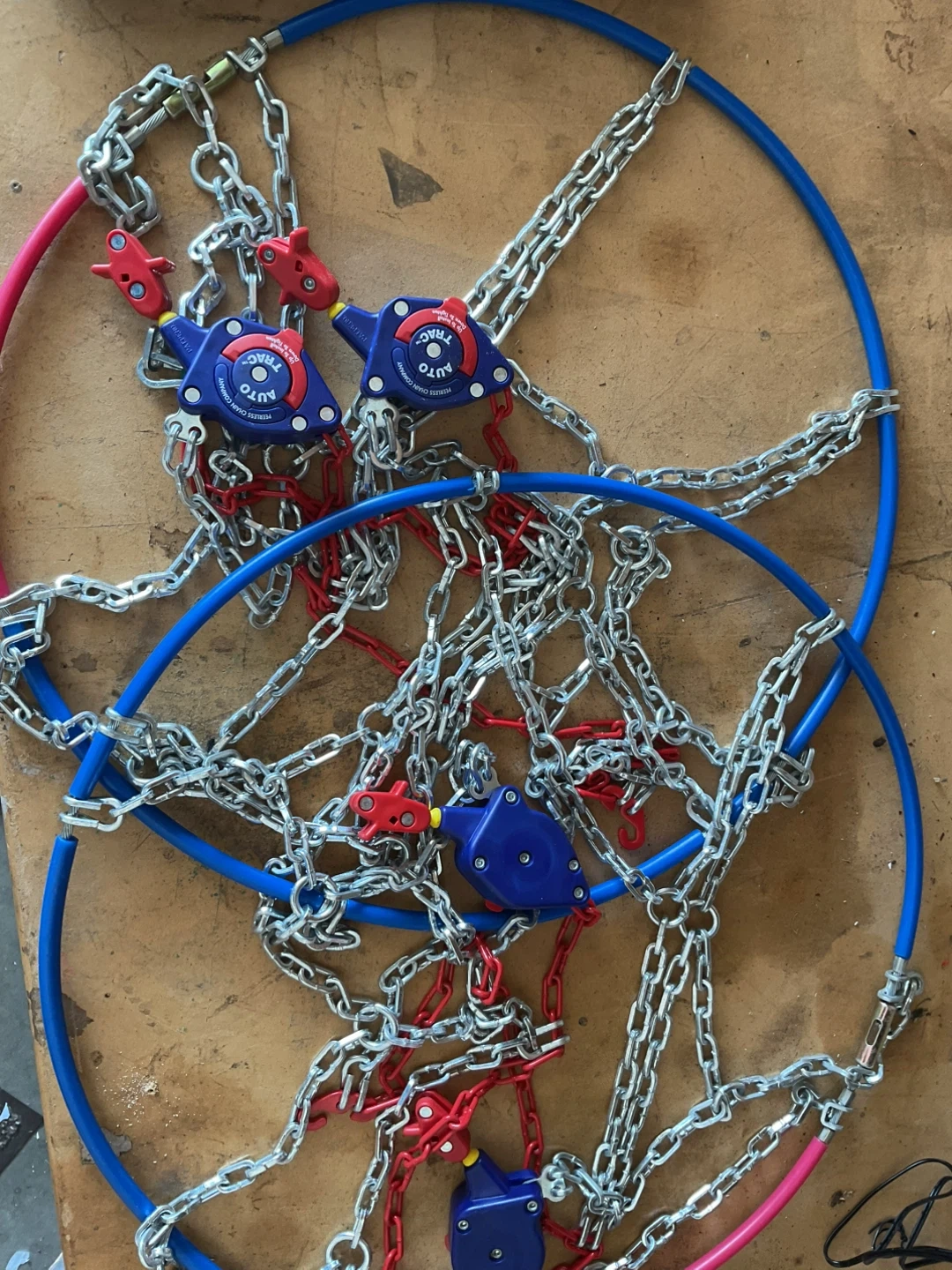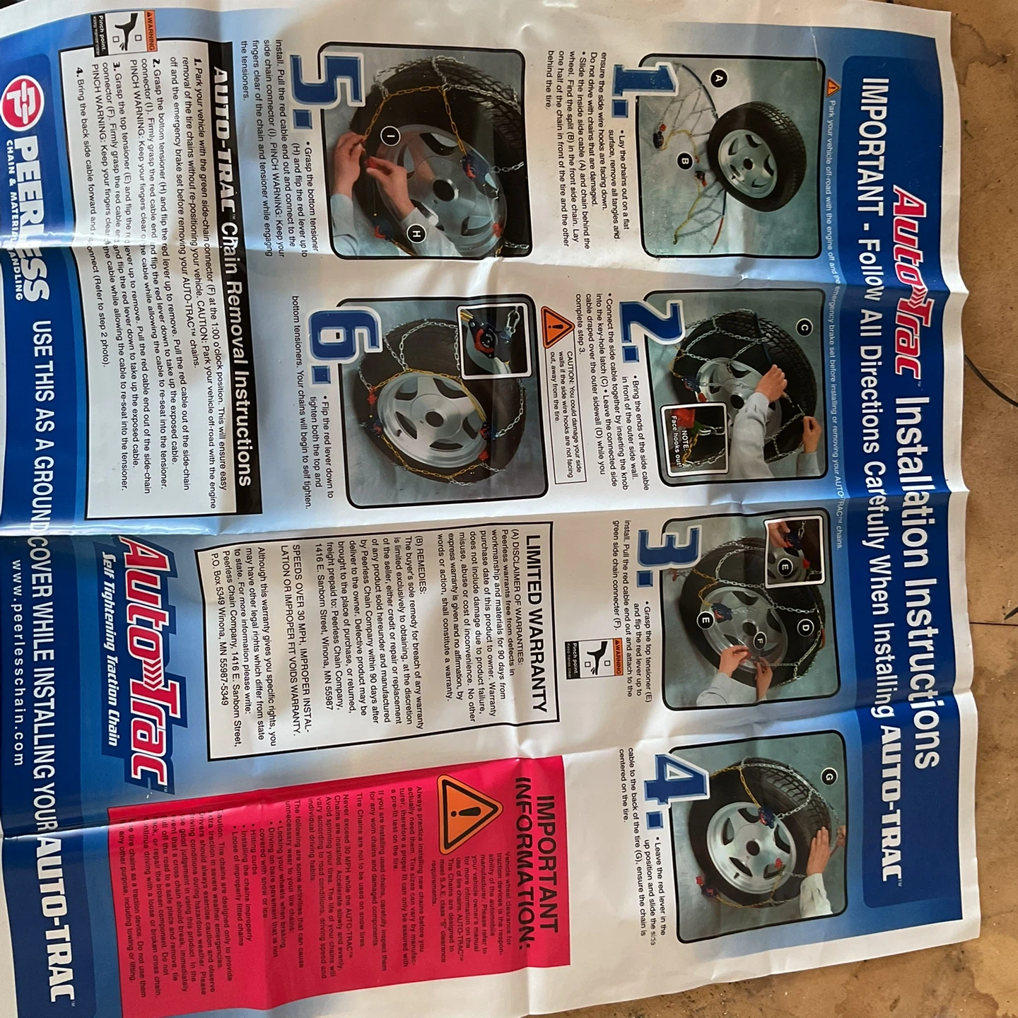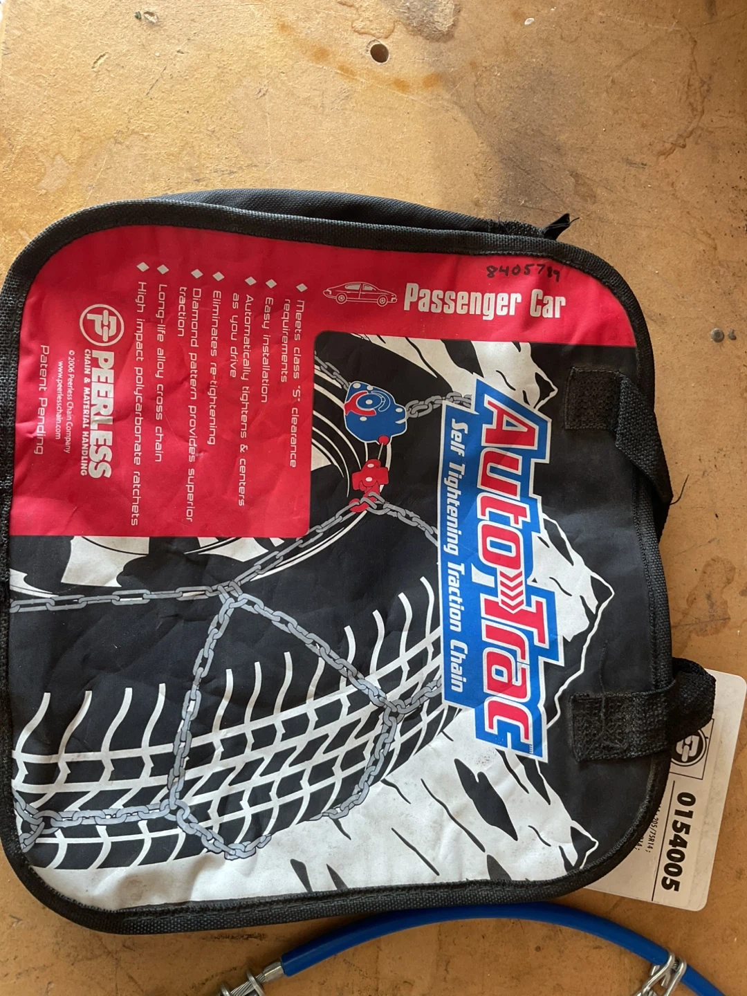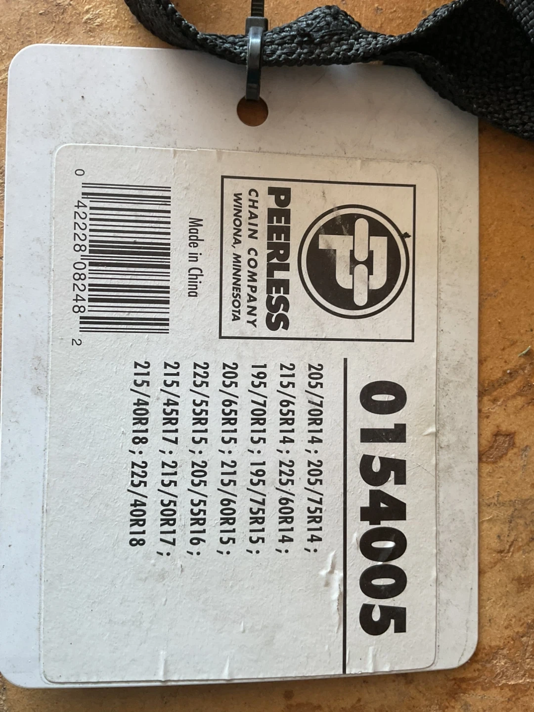 Peerless Auto-Trac Tire Chains, model 0154005. Fits tire sizes: 205/70R14, 205/75R14, 215/65R14, 225/60R14, 195/70R15, 195/75R15, 205/65R15, 215/60R15, 225/55R15, 205/55R16, 215/45R17, 215/50R17, 215/40R18, 225/40R18. They feature easy installation and self-tightening. Comes with the carrying case