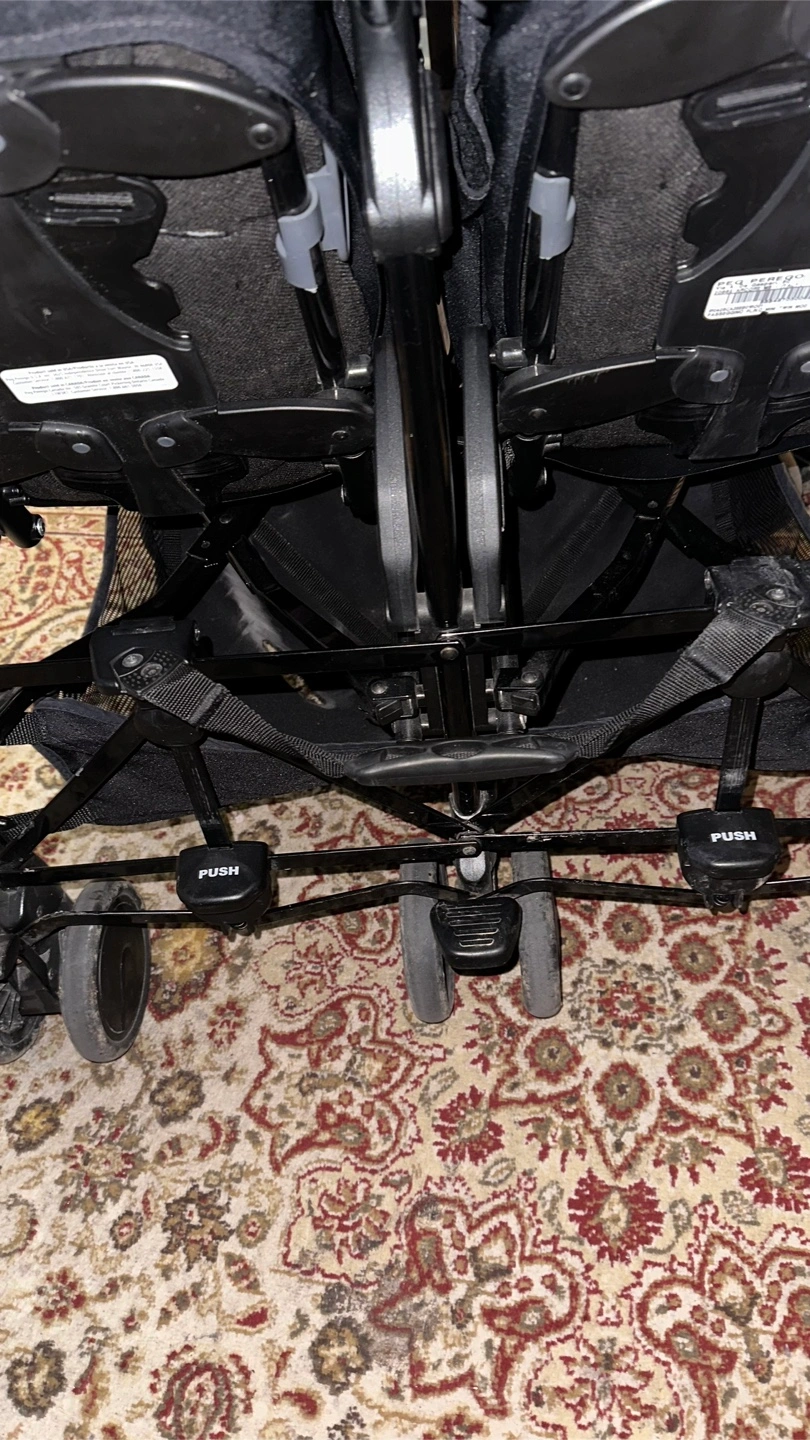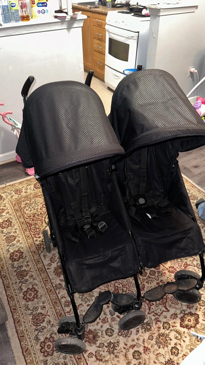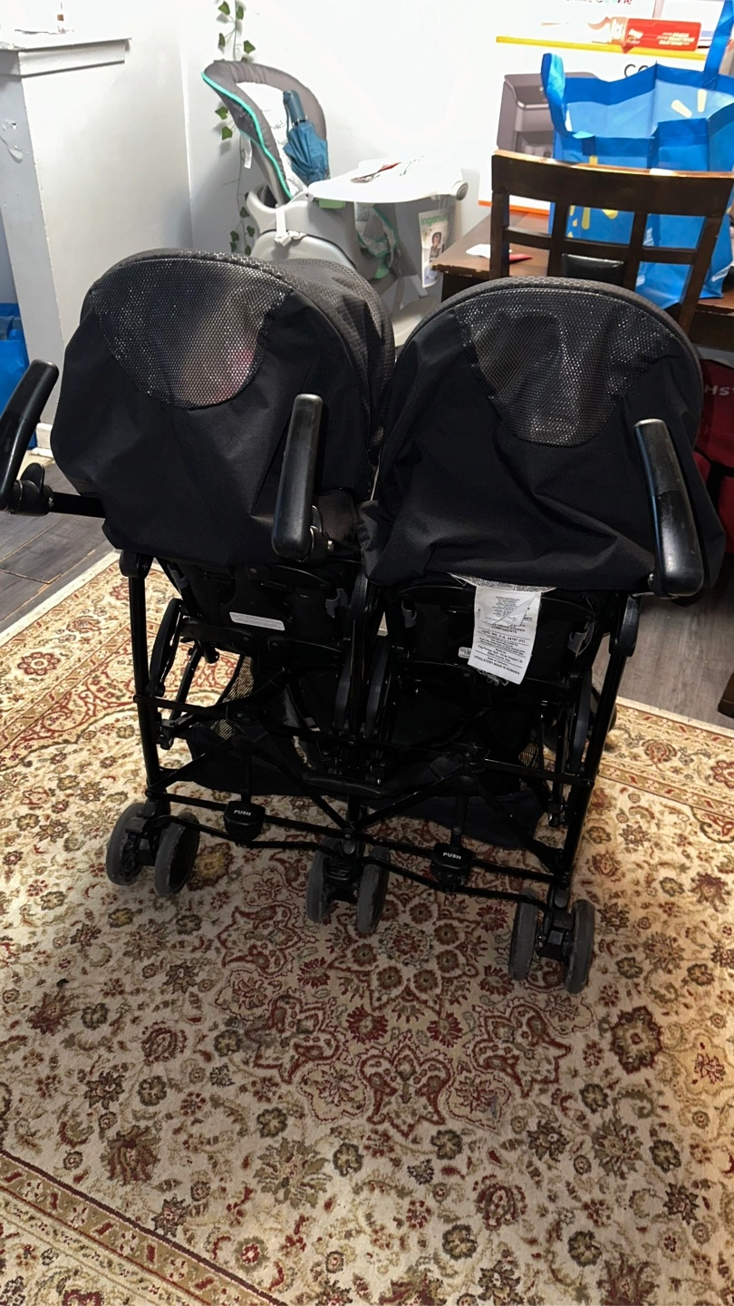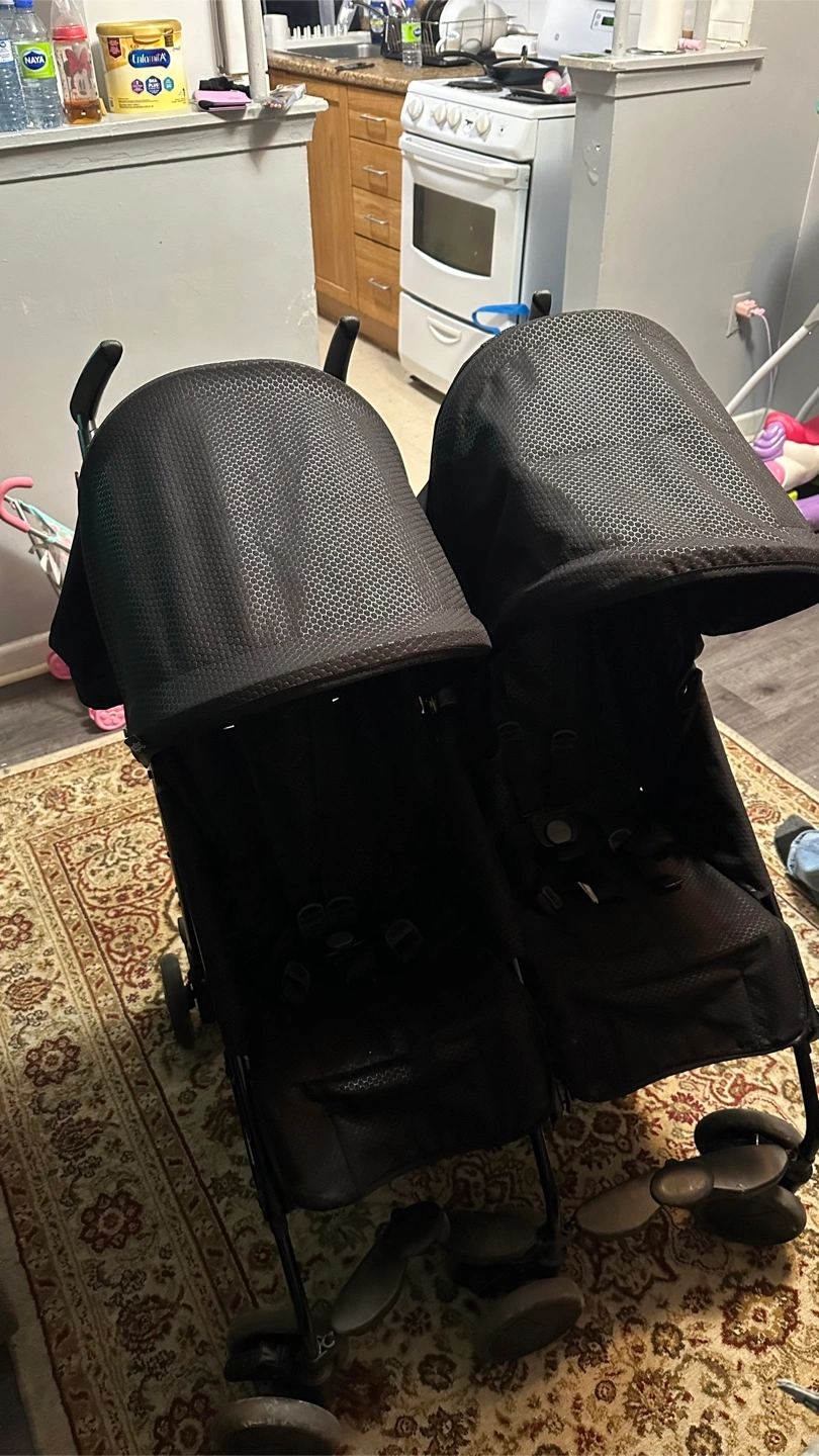 Double stroller, black. Side-by-side seating. Compact fold. Good condition. Price is negotiable Only Issue: hole in the bottom storage basket (shown in photo) can easily be sewn. Selling because my toddler is too big for it. Pickup York mills & dvp
