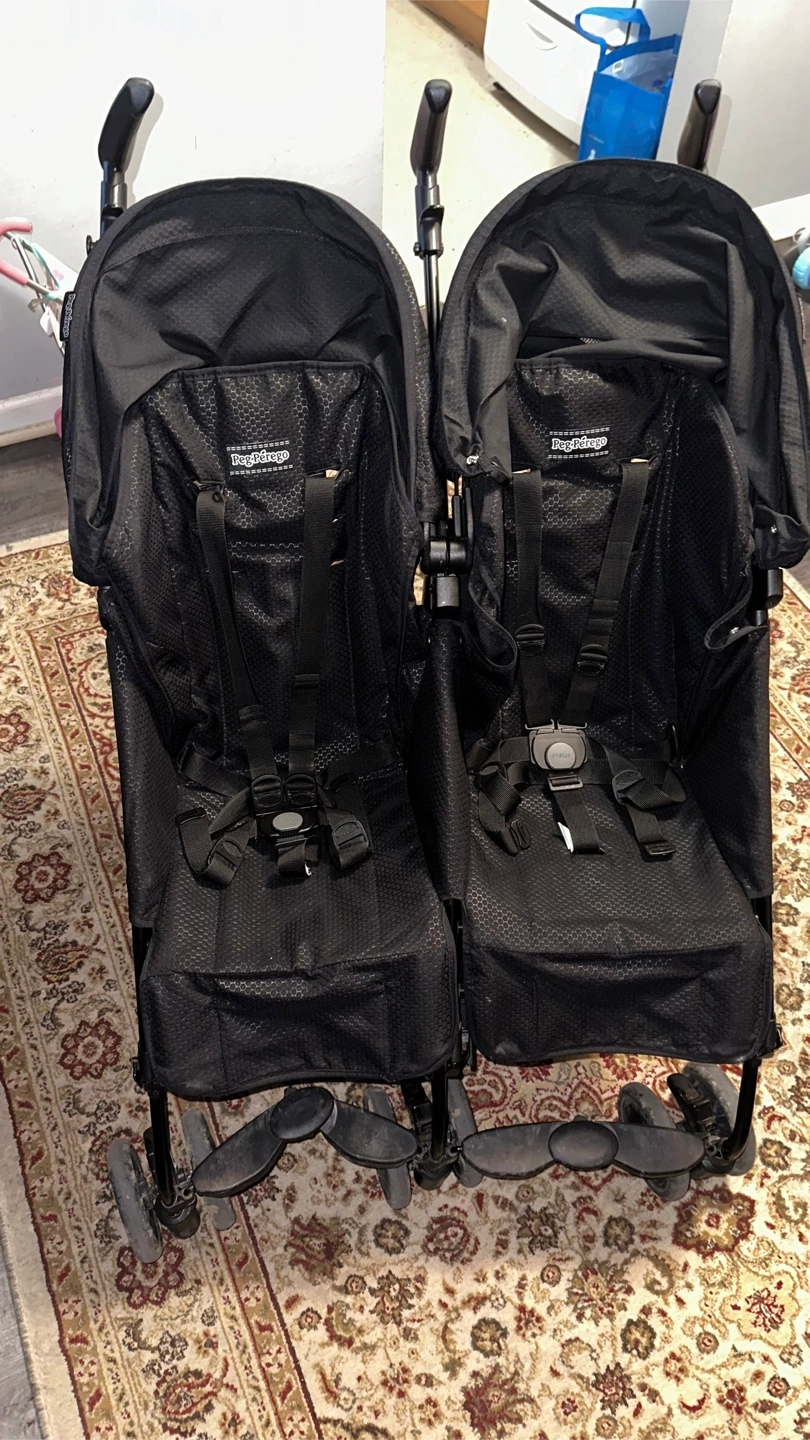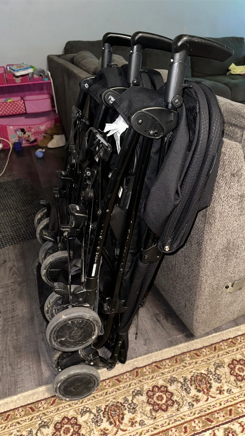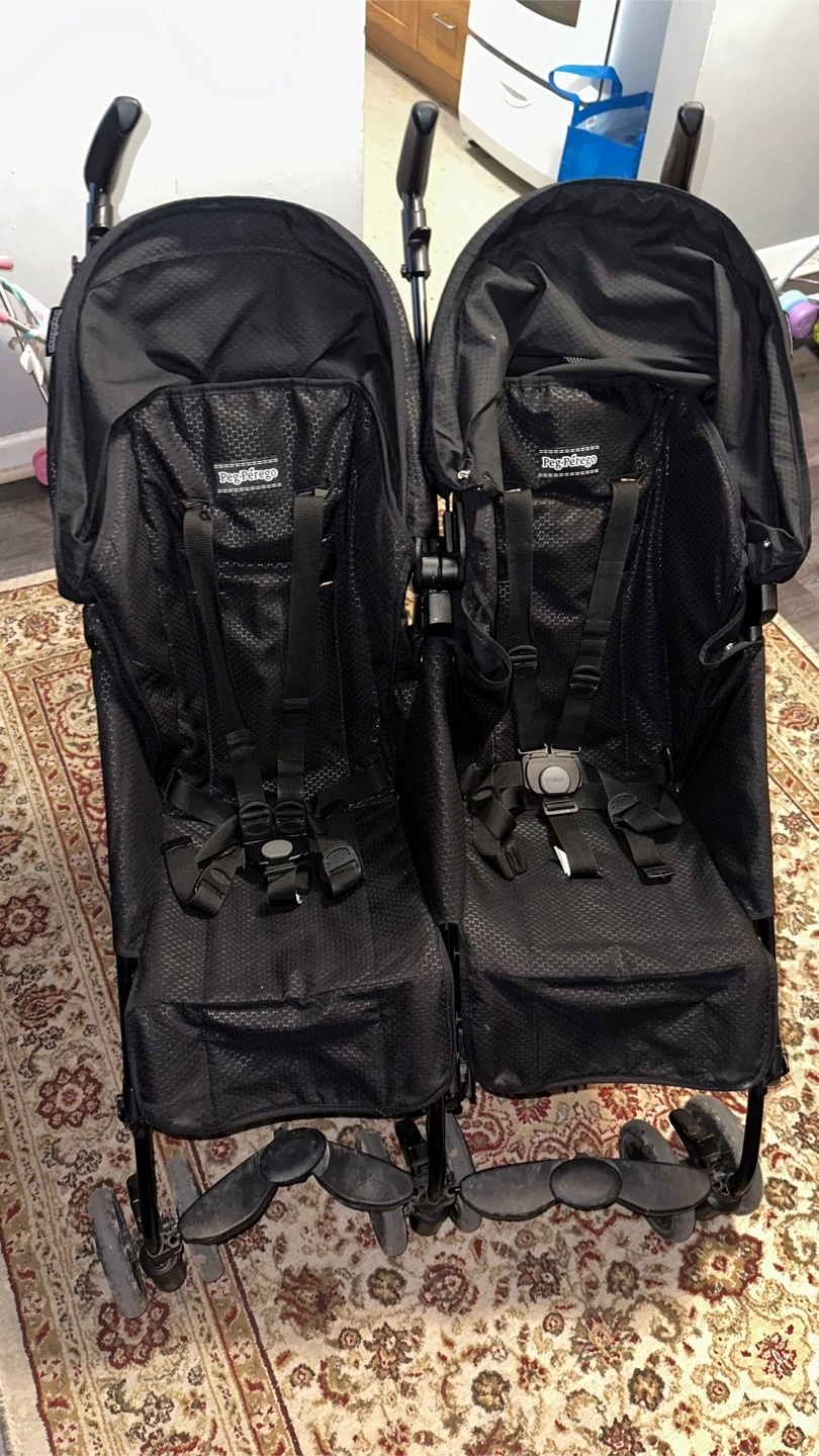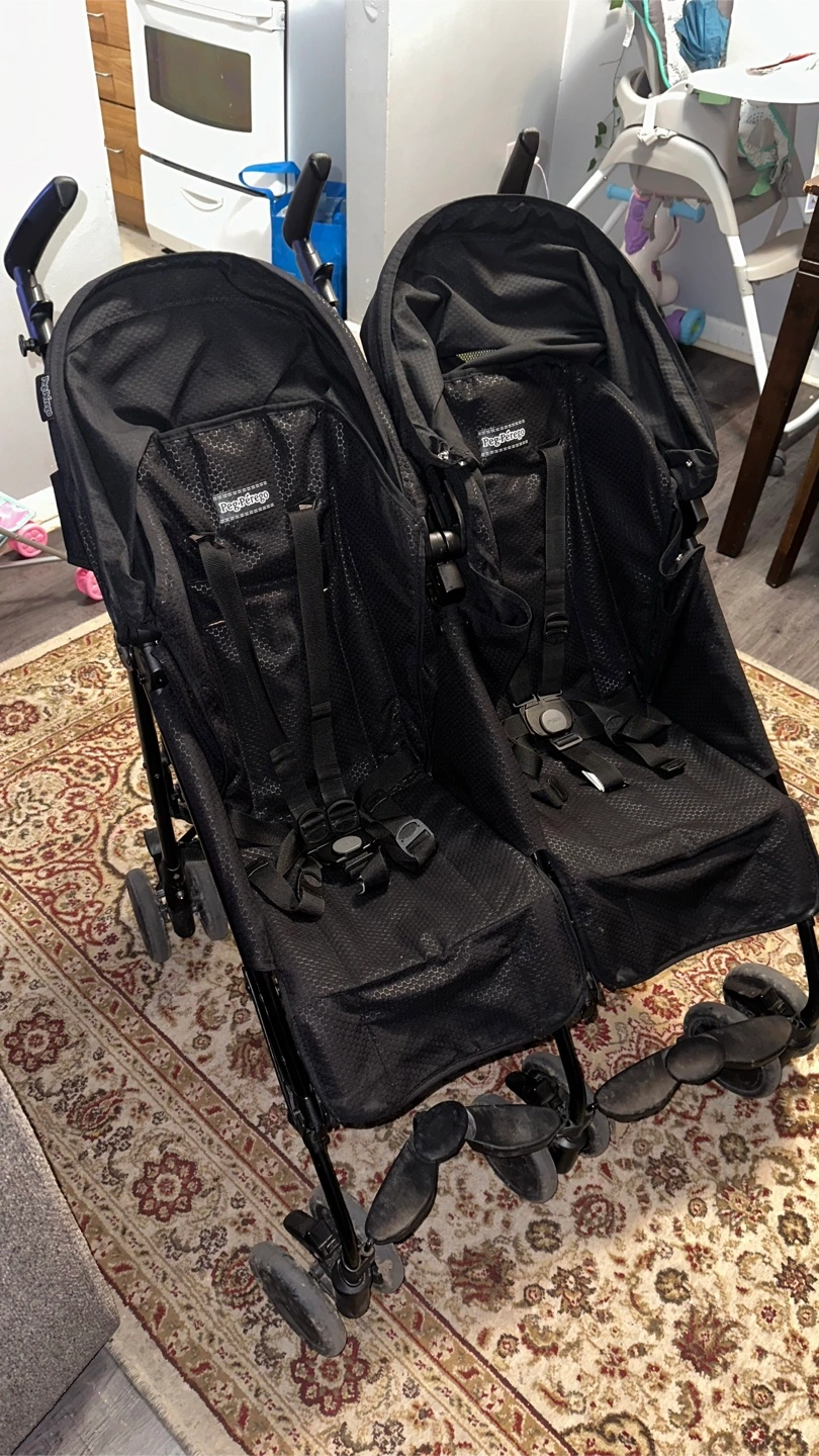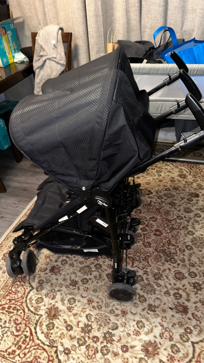 Double stroller, black. Side-by-side seating. Compact fold. Good condition. Price is negotiable Only Issue: hole in the bottom storage basket (shown in photo) can easily be sewn. Selling because my toddler is too big for it. Pickup York mills & dvp