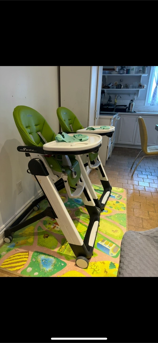 Selling a Peg Perego Siesta high chair in green. It's in good condition and ready for a new home! Perfect for meal times with your little one. Price is for one chair only! But I have 2 of them :)