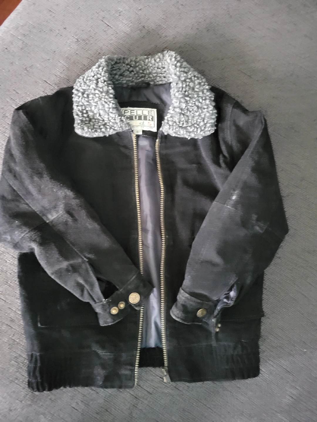 Selling a Genuine leather Pelle Cuir black jacket in size S. It has a stylish design with a sherpa collar. It's in good condition and ready for a new home