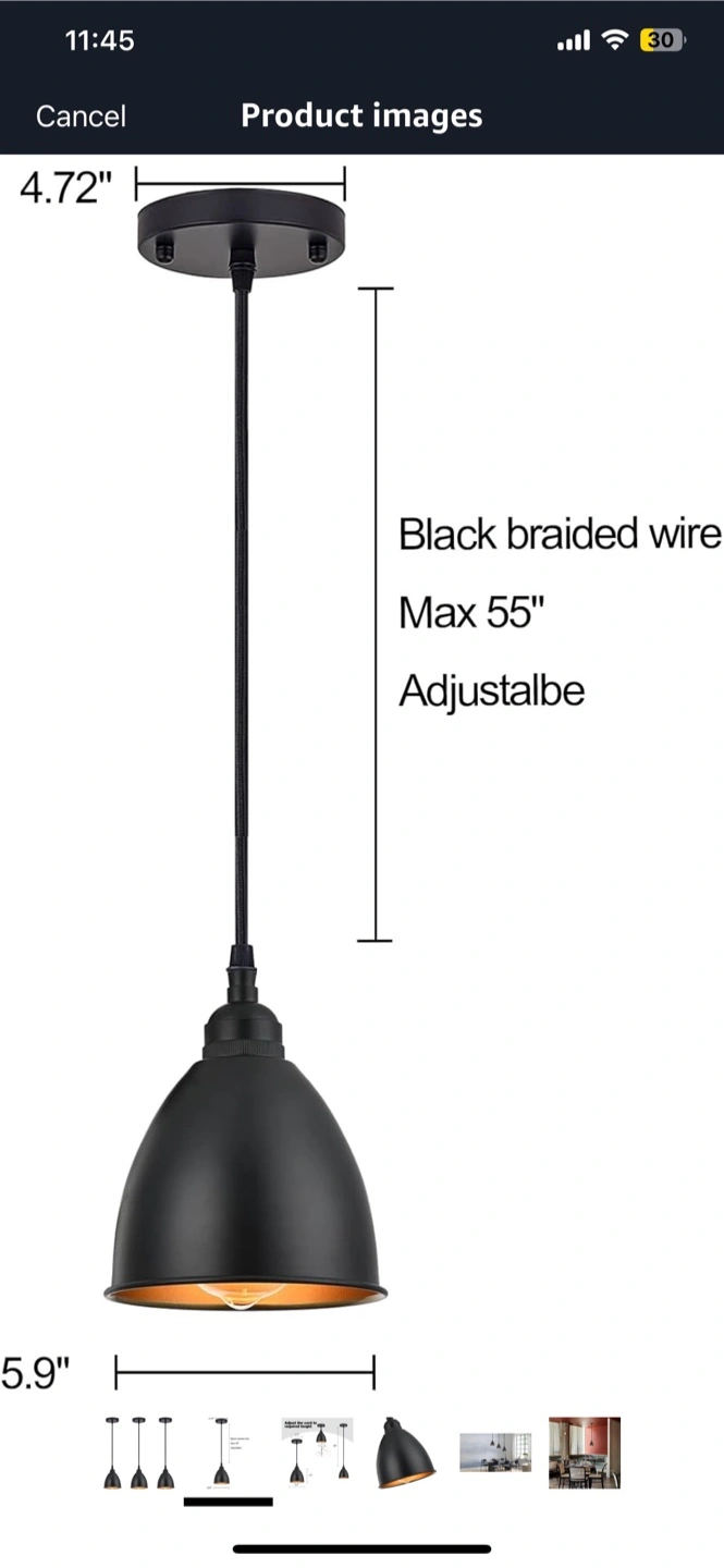 I have a brand new pendant lighting fixture still in its original box! It features a black braided wire and is adjustable up to 55 inches. The fixture itself is about 5.9 inches wide and 4.9 inches tall. It also has a 4.72-inch ceiling plate. Perfect for adding a touch of modern style to any room