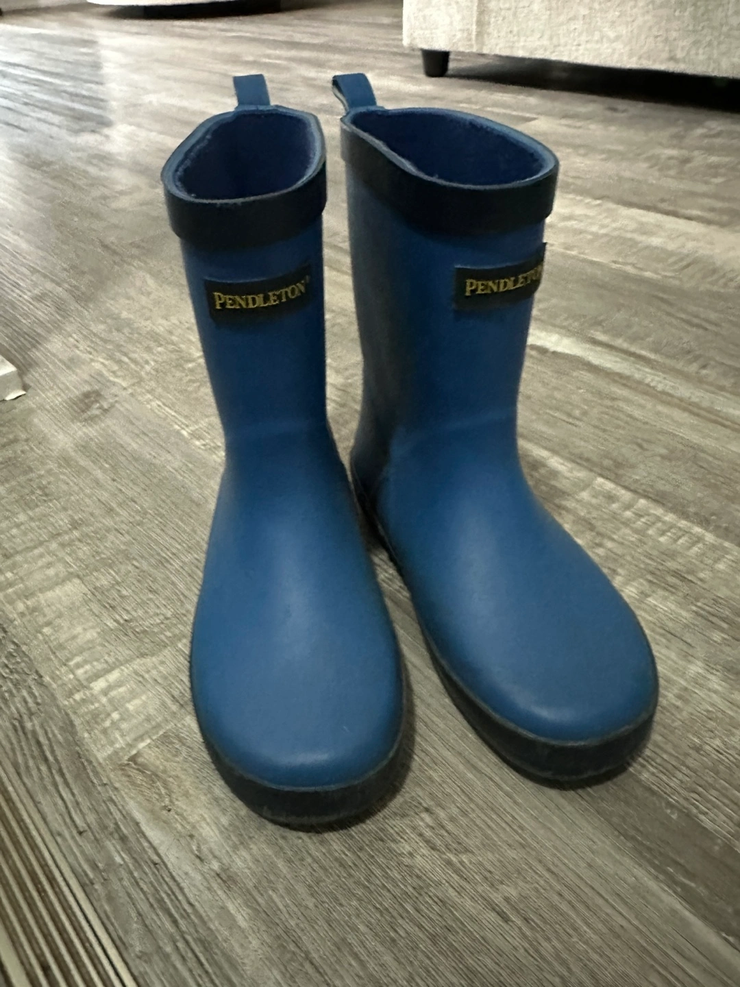 Here are some gently used Pendleton rain boots in a lovely blue colour! They are a size 1 and ready for some puddle jumping