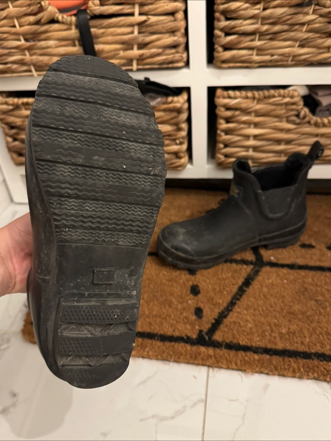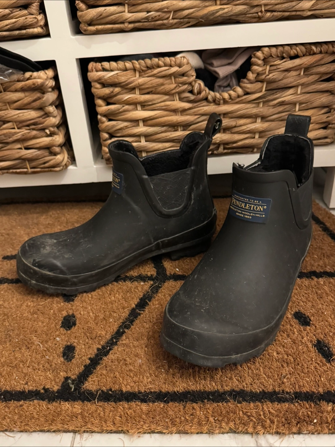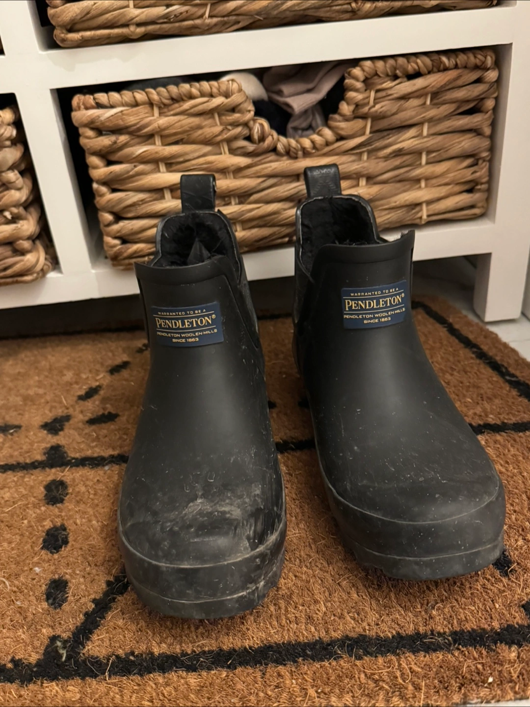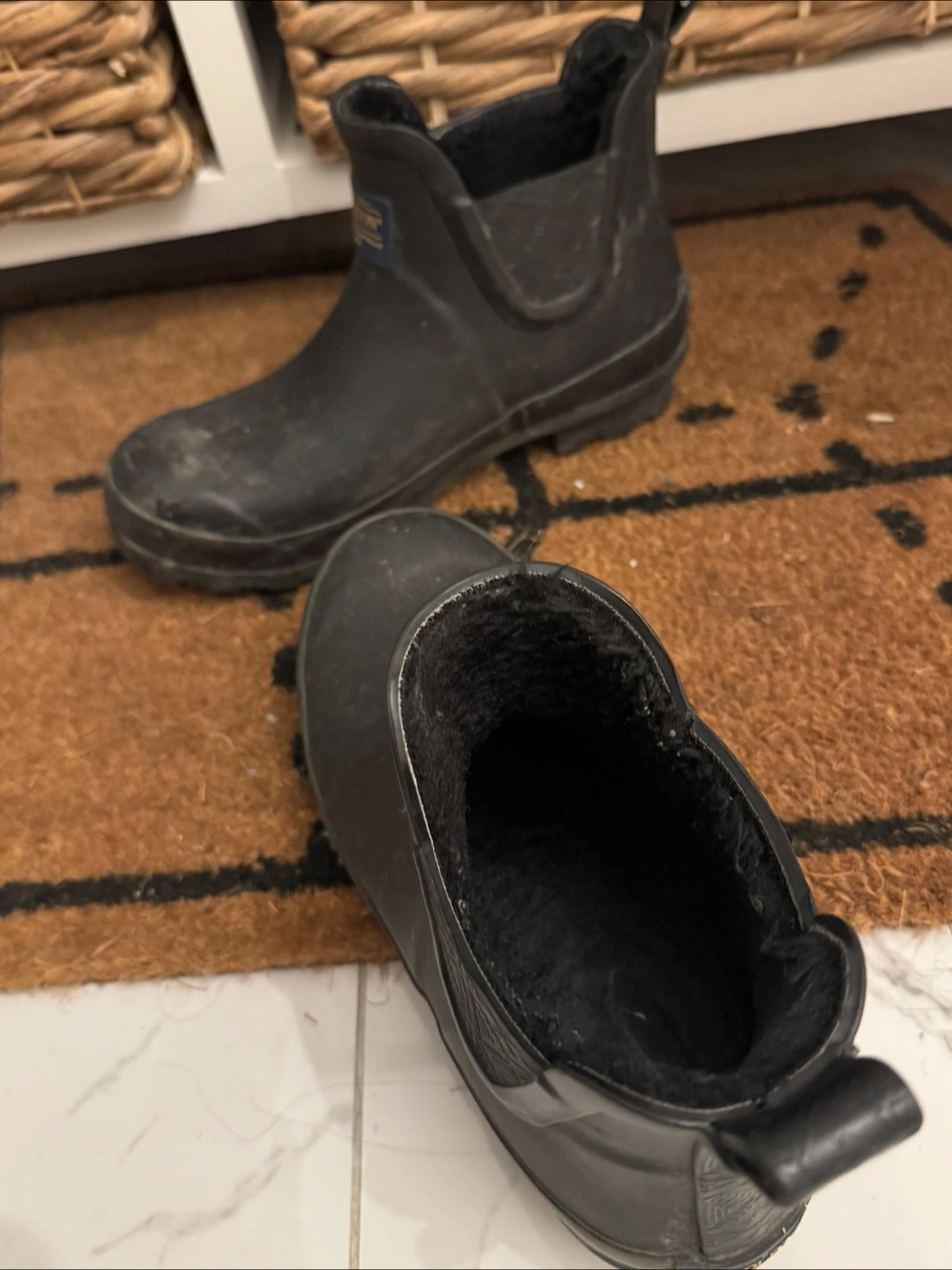 Black boots. Pull tab on the back. Elastic side panels. Rubber sole. Fleece lined. A perfect purchase for a cozy walk during a rainy day. Pickup @ Spadina/Richmond