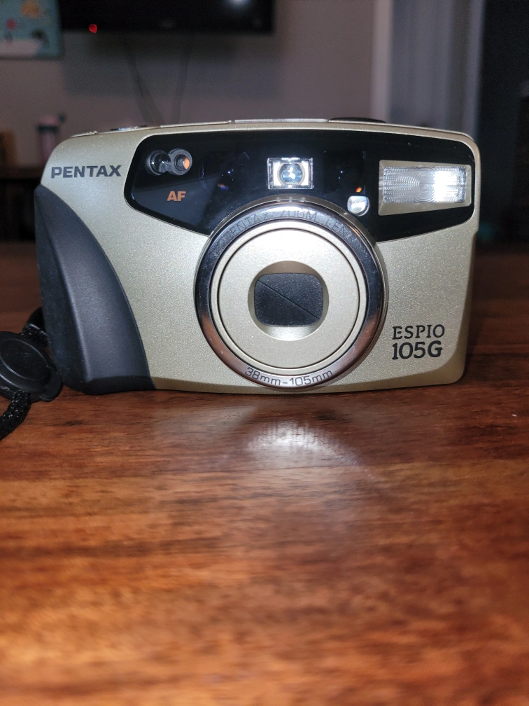 Vintage Pentax Espio 105G 35mm film camera. 38mm-105mm zoom lens. Autofocus. Compact and lightweight design. Great for casual photography. Film tested fully functional. No battery included neck strap included.