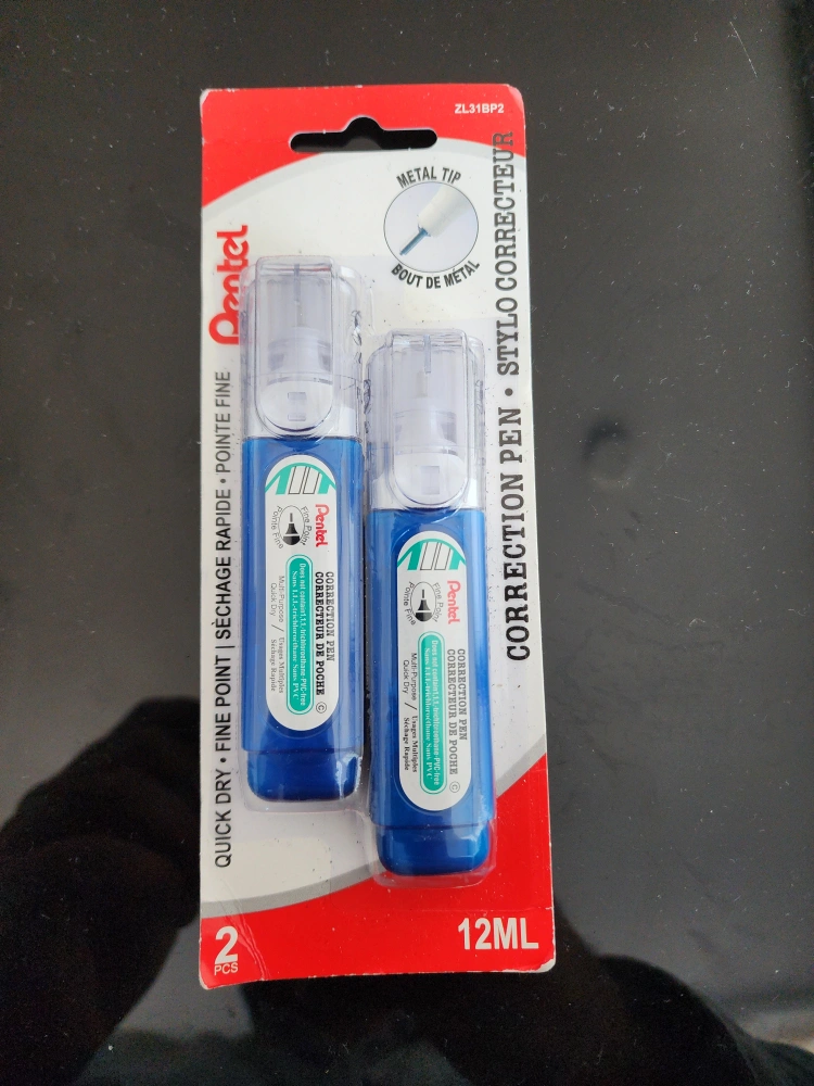 Get your hands on this handy 2-pack of Pentel Fine Point Correction Pens! Each pen contains 12mL of correction fluid and features a metal tip for precise application. Perfect for quick, dry corrections on the go!