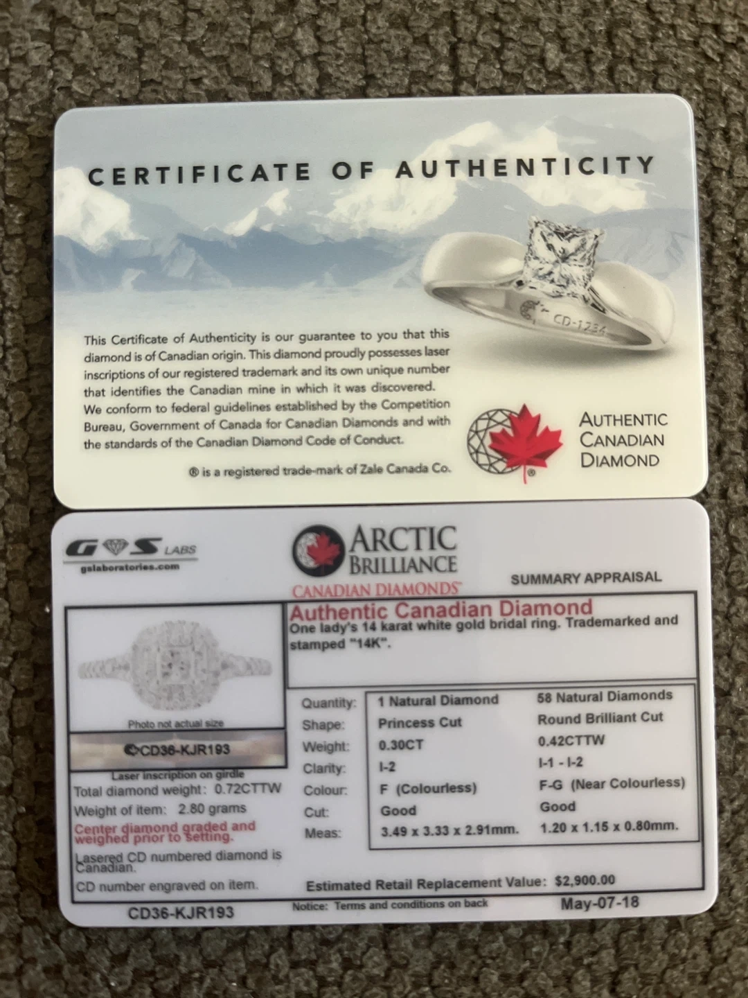 Selling a beautiful diamond ring from People's. It comes in its original box, ready to be cherished. 14kt white gold bridal ring. Size 7. 1 princess cut natural diamond 0.30ct surrounded by 58 natural diamonds at 0.42ct.