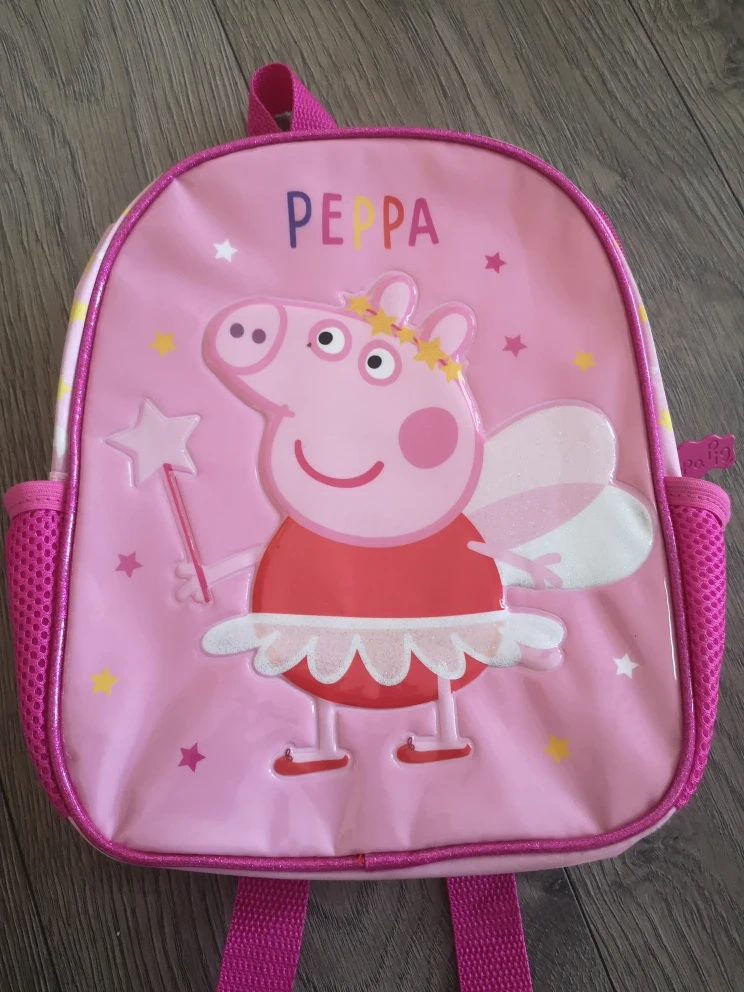A cute pink Peppa Pig backpack! Perfect for your little one. It features Peppa as a fairy. The backpack is in great condition and ready for new adventures