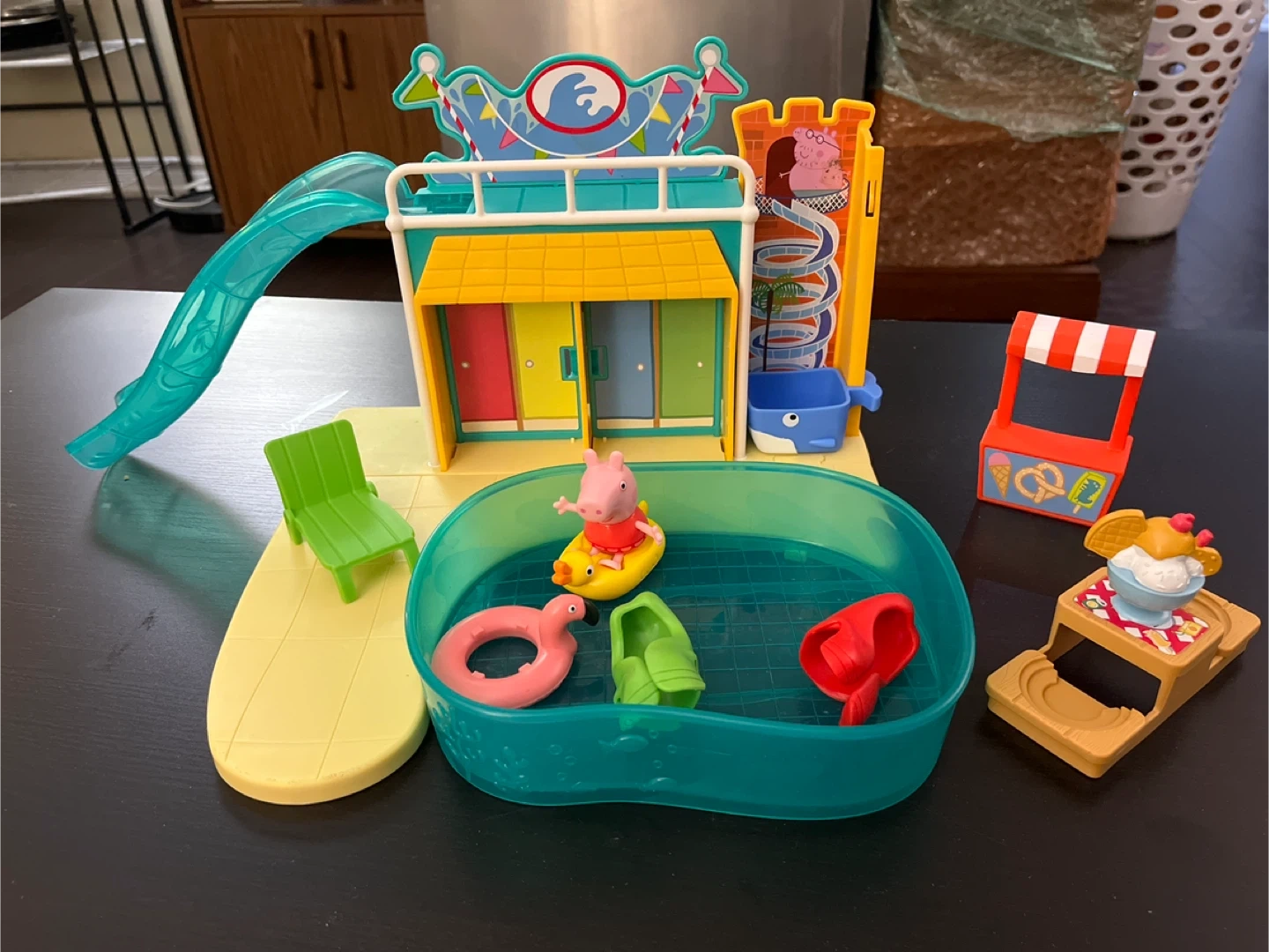 This is a cute Peppa Pig Water Park playset. It includes a slide, pool, snack bar, and Peppa Pig herself! (Missing peppa pigs brother) $10 OBO