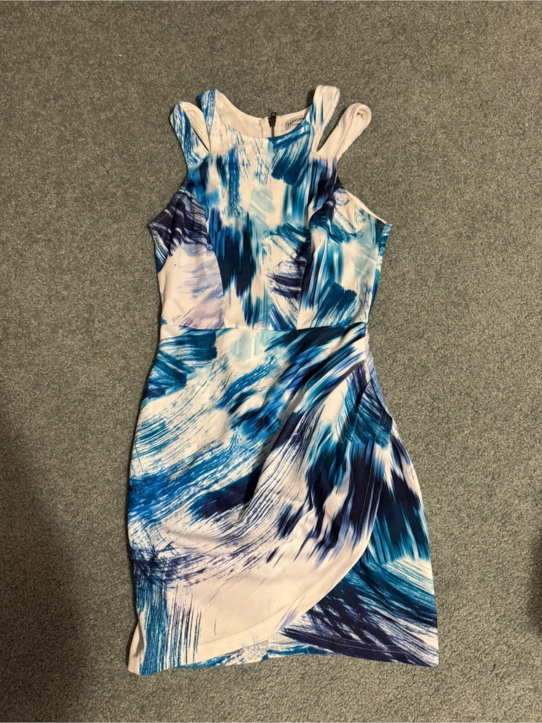 Selling a Peppermayo sleeveless dress in a beautiful blue and white pattern! It's a size 00 (fits like a small) and features a unique design with a zipper in the back. Perfect for a summer day out or a special occasion