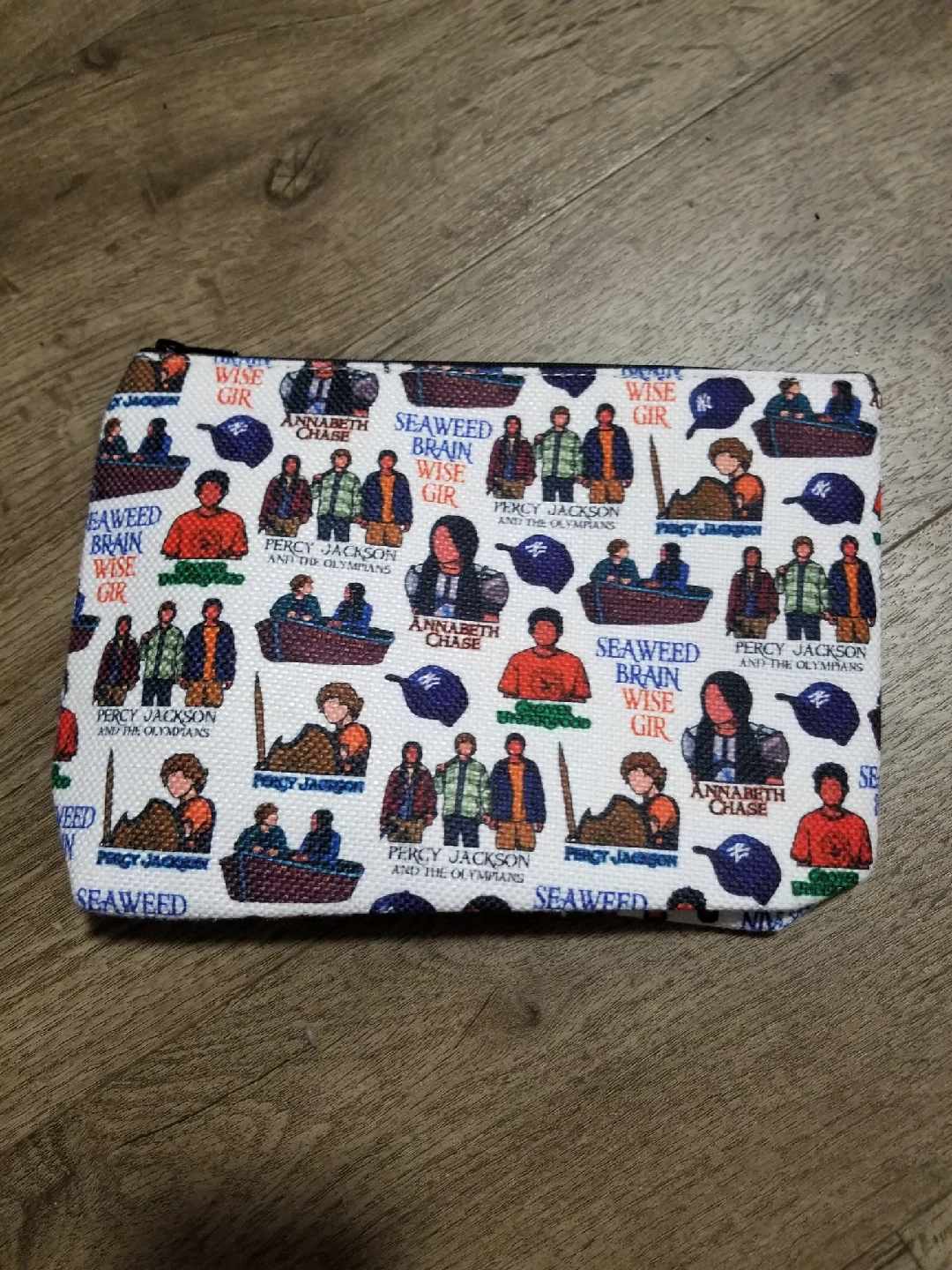 This is a cute little zipper pouch with a Percy Jackson print! It features characters and phrases from the series, like Annabeth Chase and "Seaweed Brain". Perfect for carrying small items! Brand new