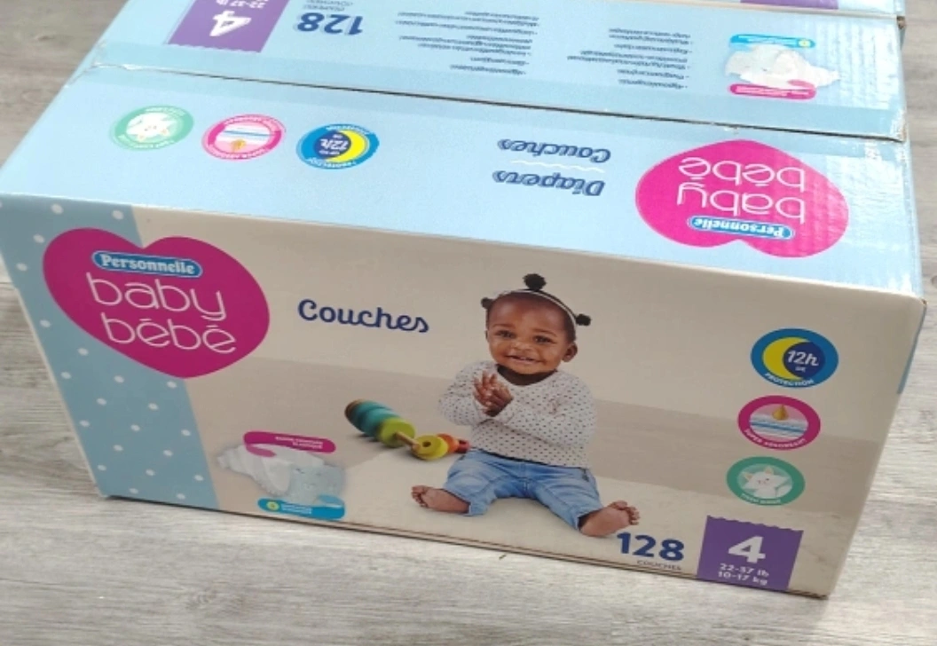 Selling a box of Personnelle Baby Bebe diapers, size 4. The box contains 128 diapers, perfect for babies weighing 22-37 lb (10-17 kg). These diapers offer 12-hour protection and are designed to be super absorbent and soft for your baby's comfort
