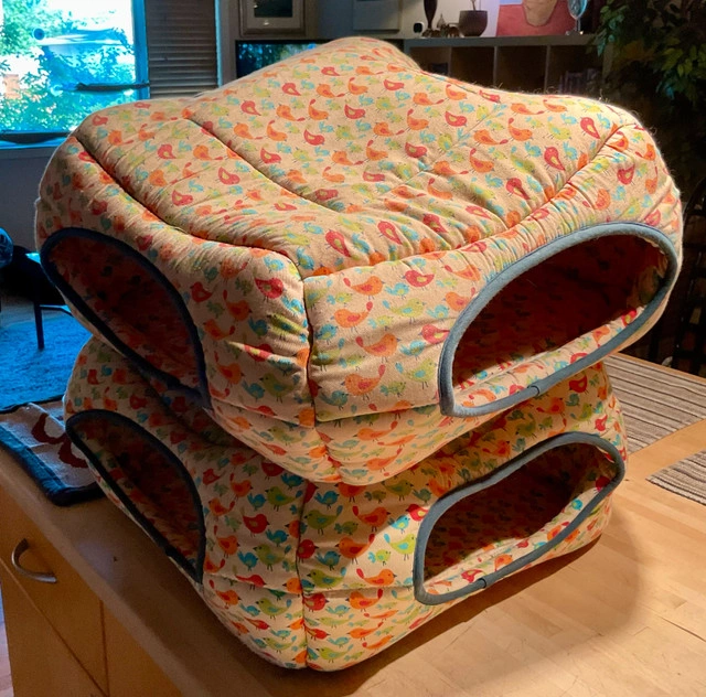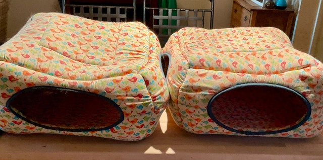 Price is for both. These bird-themed covered pet beds are designed to provide a secure and cozy space for your furry friends, each featuring a unique bird pattern and a cushioned interior for ultimate comfort. These beds are in good condition. Here are some features of these beds: * Soft, cushioned interior * Bird-themed pattern * Can be collapsed flat Pick up in Killarney