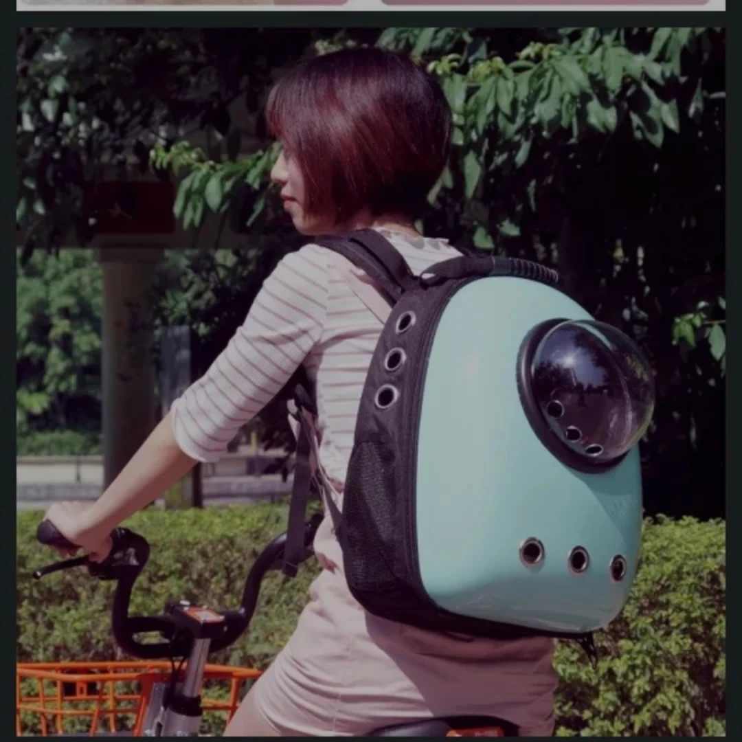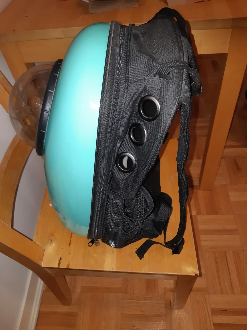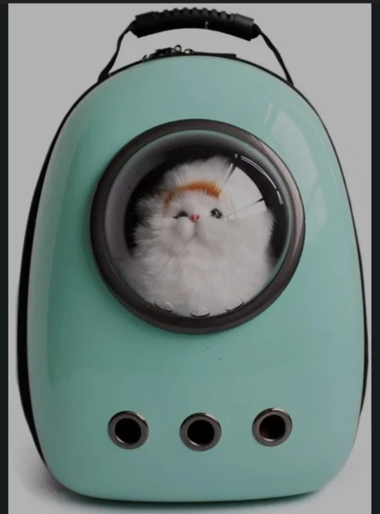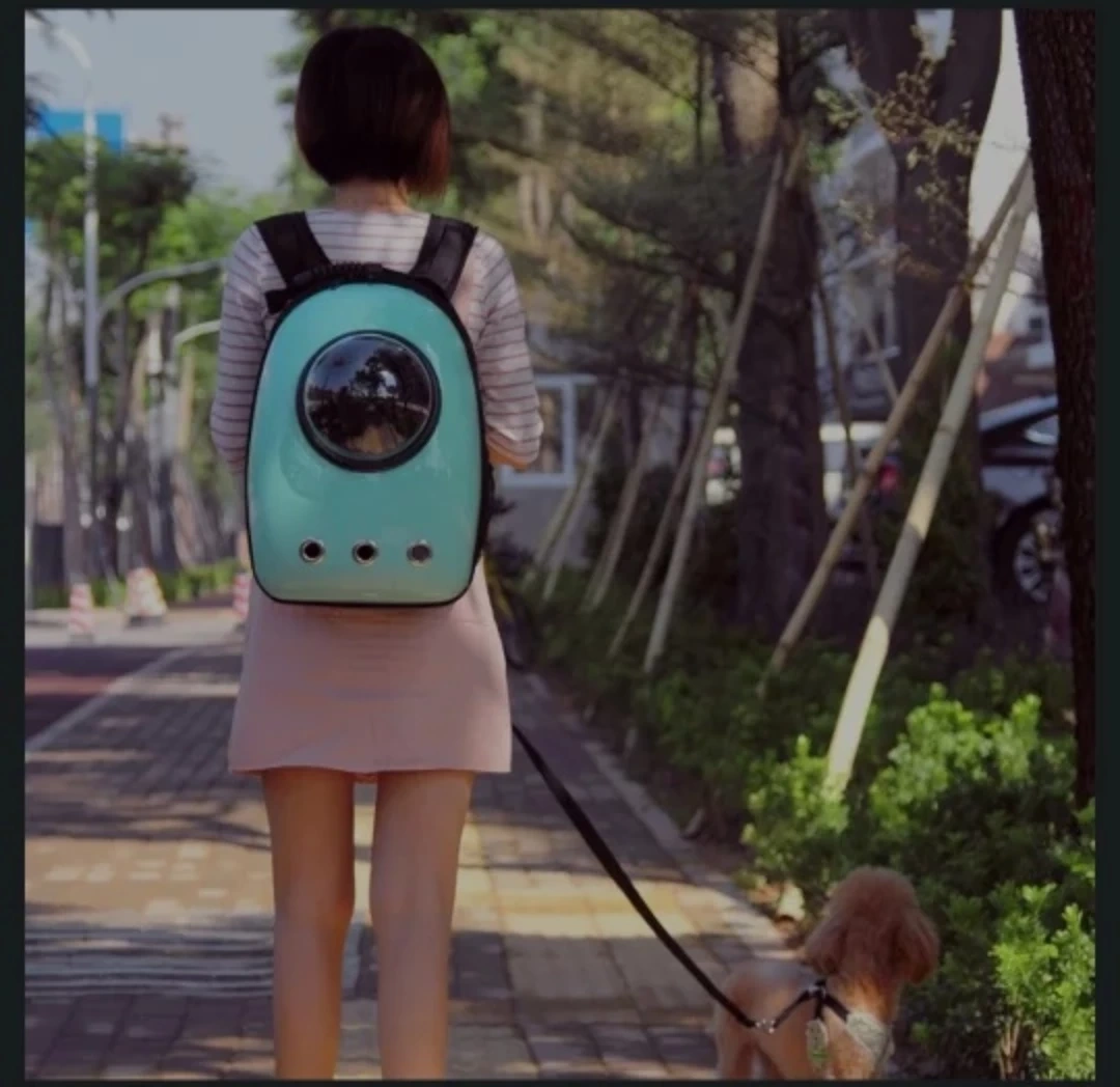 This is a super cute pet carrier backpack! It's designed with a space capsule bubble window for your furry friend to enjoy the scenery. It's mint green and black, perfect for cats or small dogs up to 14 pounds. The dimensions are approximately 16.5" x 12.6" x 11.5".
